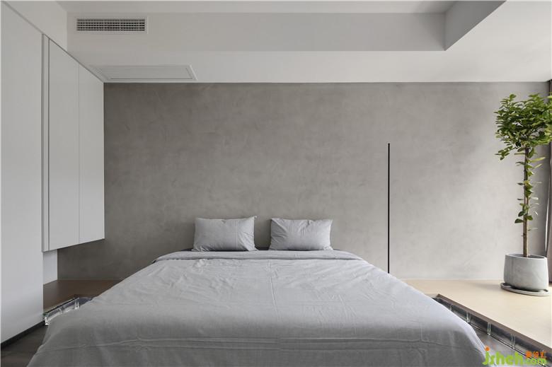 ▲主臥床頭背景墻設(shè)計(jì)師選擇了磐多魔墻面涂料,清水灰的細(xì)膩?zhàn)尶臻g呈現(xiàn)出優(yōu)雅清爽,簡單又樸素的別樣感受。主臥與餐廳的分割為家中增添了獨(dú)立的洗滌晾曬區(qū)域,也為臥室保留了一處榻榻米,讓主臥空間更富變化。