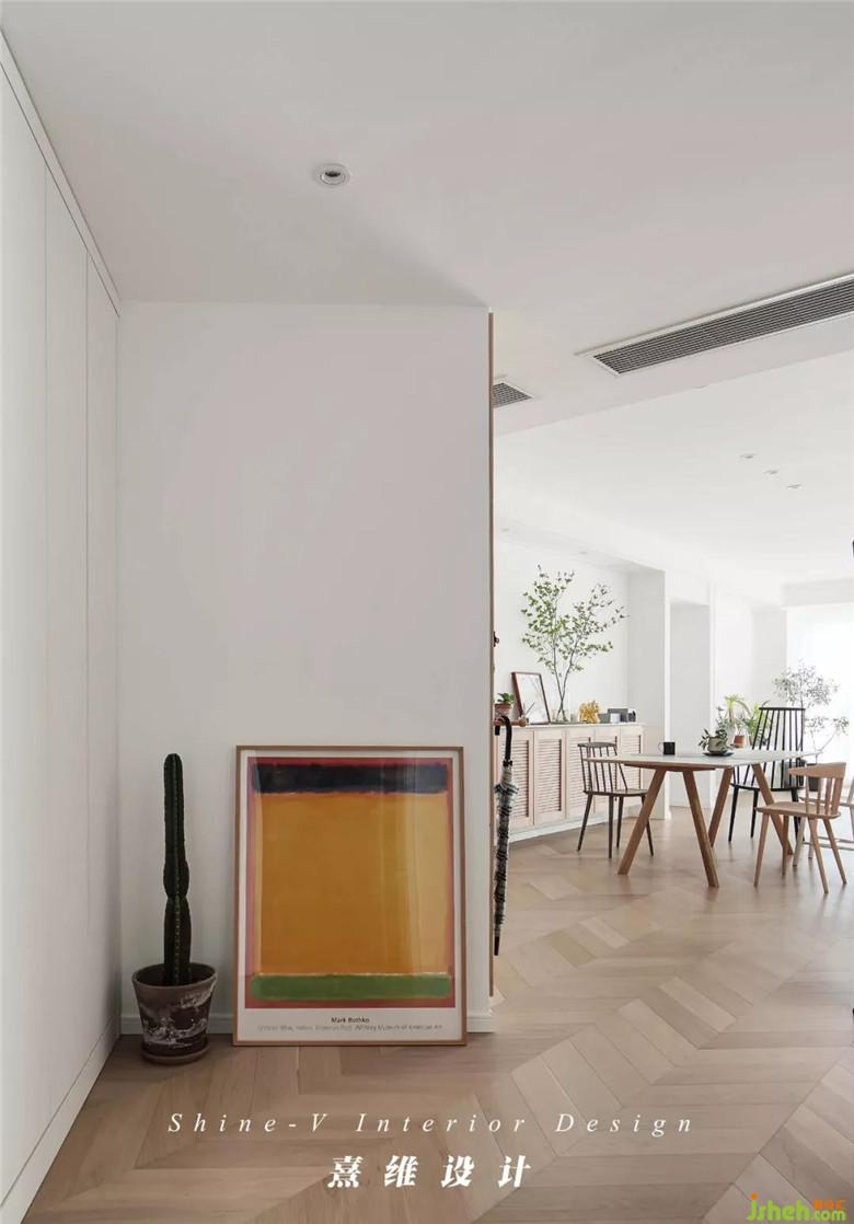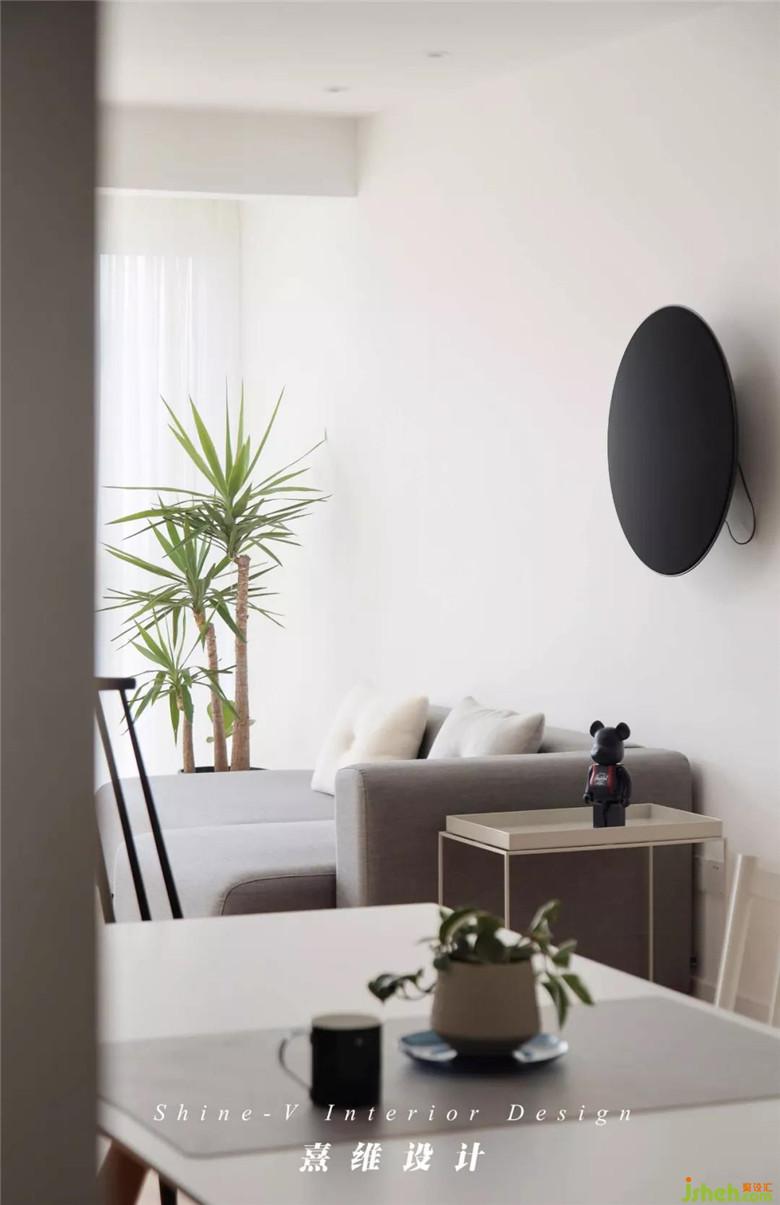 ▲入戶之后,一截新砌的薄墻,將柜體與冰箱組合的背面遮掩起來充當(dāng)為玄關(guān)。簡(jiǎn)單的區(qū)域劃分并不影響整體空間的通透,畫與植物倚靠的白墻也像是在家中等待你的模樣。裝修公司