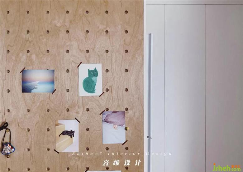 ▲玄關(guān)的墻體與柜體側(cè)面覆上原木色洞洞板方便物品收納也適用于留存記憶瞬間。