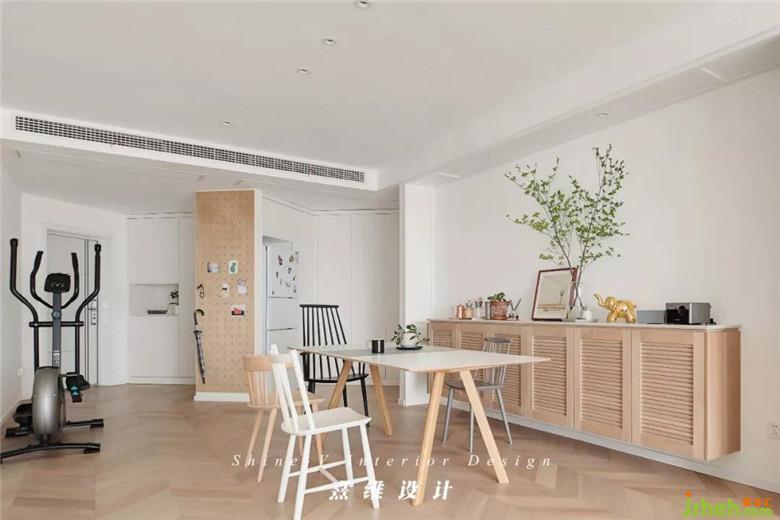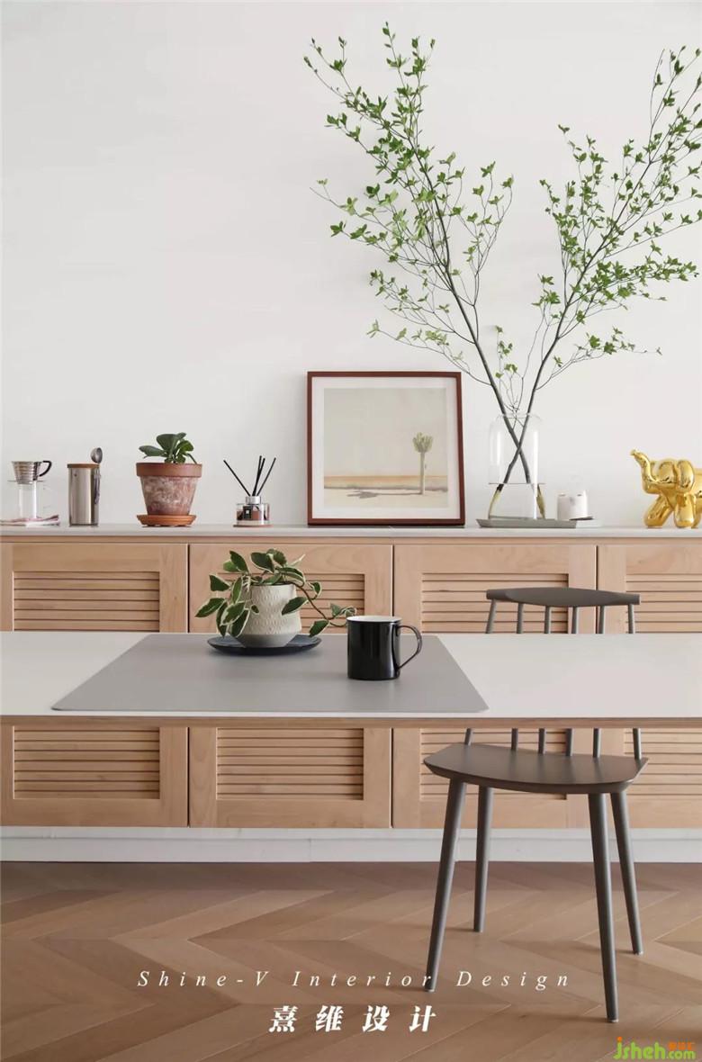 ▲餐廳之中從白與原木色中醞釀出輕松的氛圍,魚骨形拼接的地板,離地餐邊柜的百頁柜門都是細(xì)致的小心思,線條輕盈的餐桌椅落在地板上的姿態(tài)宛若凝固的舞姿。
