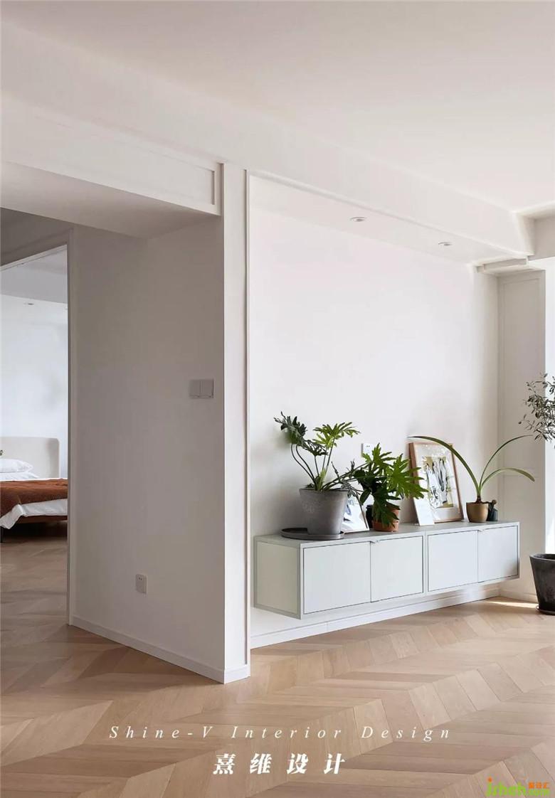 ▲一整面的白色柜體,開放與封閉、不同大小的規(guī)劃提供的實(shí)用性是完全可以滿足日常需求的。開放式的隔層方便常用物品的取用,也利用擺放的物品成為柜體本身的裝飾。一束隨意扎起的尤加利葉掛在柜子的把手上,這樣清亮的綠與白讓時光不會在此處草草收場。