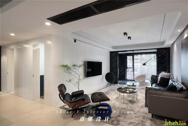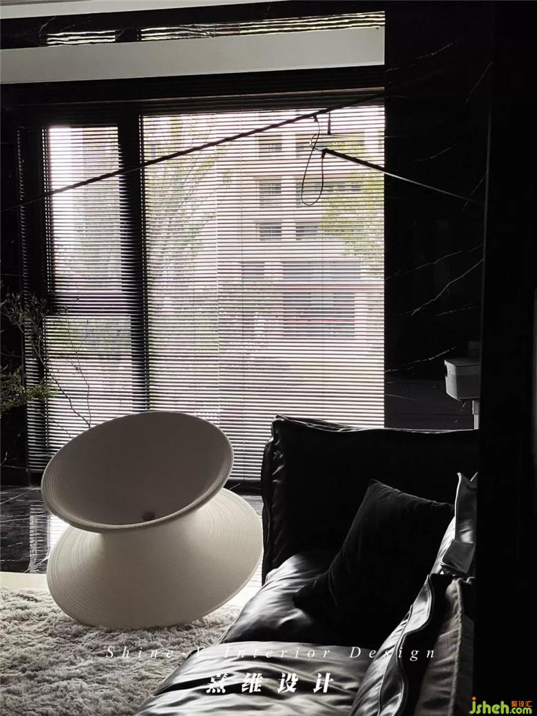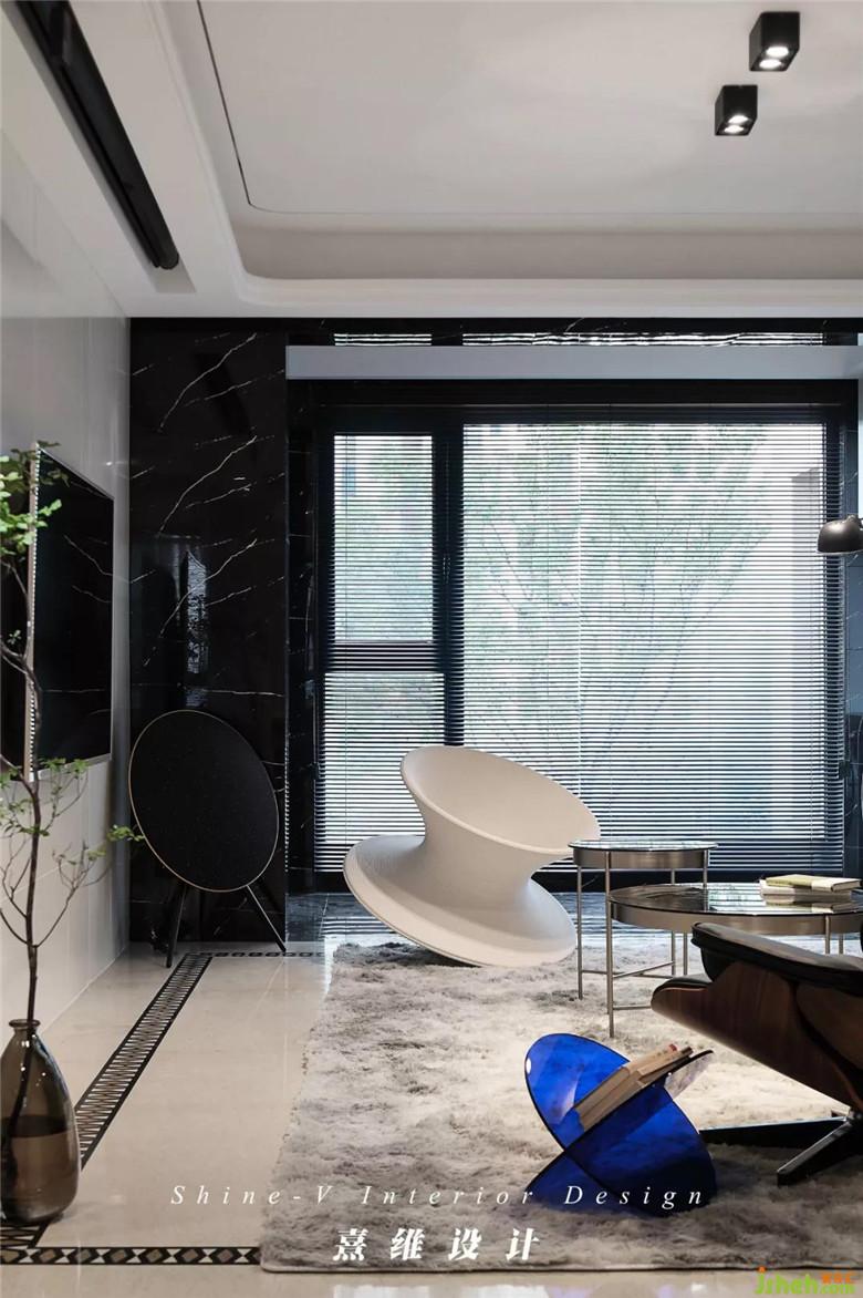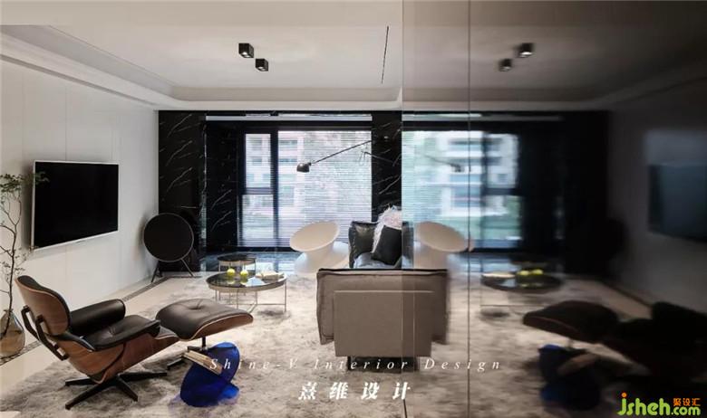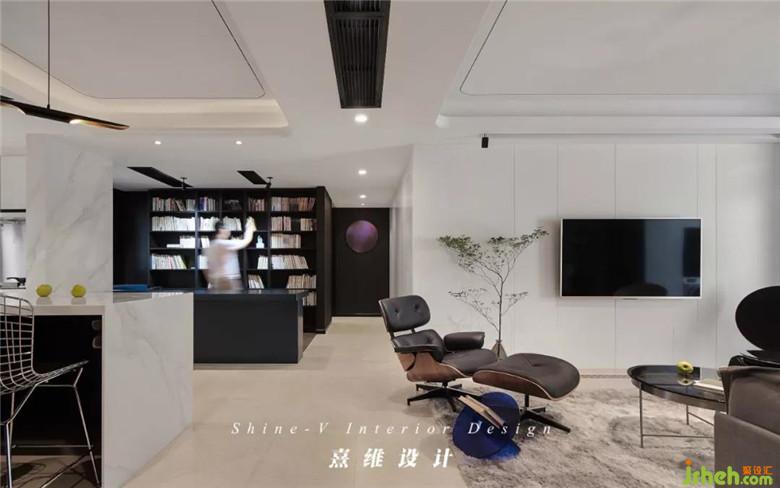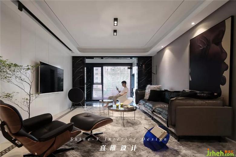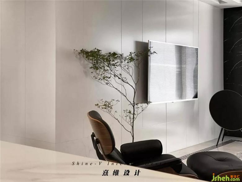 皮質(zhì)的沙發(fā)輪廓分明,灰黑的配色與白色電視背景墻相對,視覺感更具張力。帶腳凳的伊姆斯椅,符合人體工程學(xué)的設(shè)計配合內(nèi)側(cè)的皮質(zhì)軟墊,是復(fù)古的輕奢兼具現(xiàn)代外型的自由體驗。