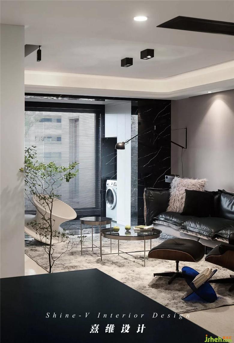 丹麥Bang&Olufsen音箱與Magis的陀螺椅,一黑一白,也是整個空間改造后所遵循的主要配色,分明又飽含張力,區(qū)別于傳統(tǒng)家具外型設(shè)計的轉(zhuǎn)折,保證功能之下,又額外為家中增加的趣味。封閉之后的陽臺,拆除移門與客廳連通起來,在黑色瓷磚包圍的陽臺中,白色的陽臺柜增加了儲物空間,小小的功能分區(qū)配色也與整體空間呼應(yīng)。