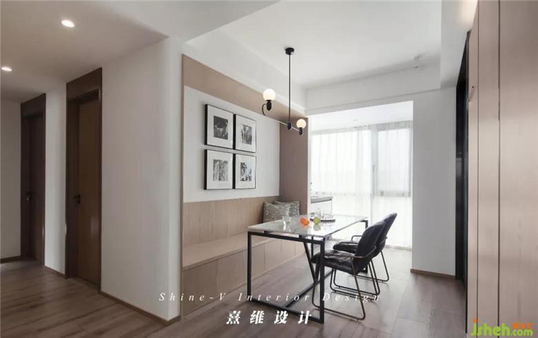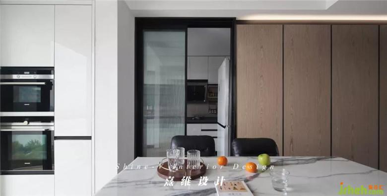 ▲原戶型過狹窄的餐廳,為了進入廚房的動線通暢,餐桌擺放選擇半卡座形式,節(jié)省空間也不會犧牲用餐時入座的舒適度。將卡座兩側(cè)墻體與小吊頂收口至與卡座齊平,空間更加規(guī)整起來。