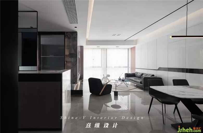 ▲打開家門,餐廳與島臺列于門的兩邊,裝修公司將視線延伸至擁有兩扇大落地窗的客廳處??臻g中黑白色的搭配引入克制與安靜的力量,不比色彩繽紛所飽含的張力、可傳遞的豐富情緒,卻更適合抓住快節(jié)奏的城市生活中難得的靜宜。
