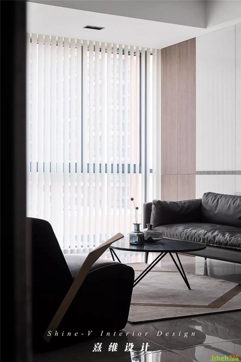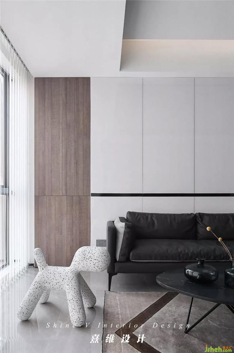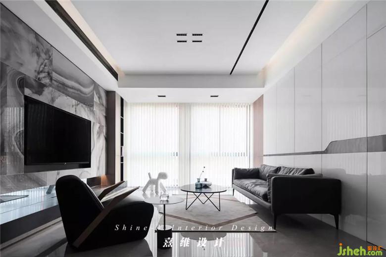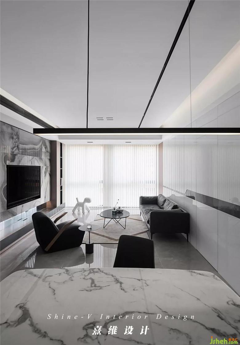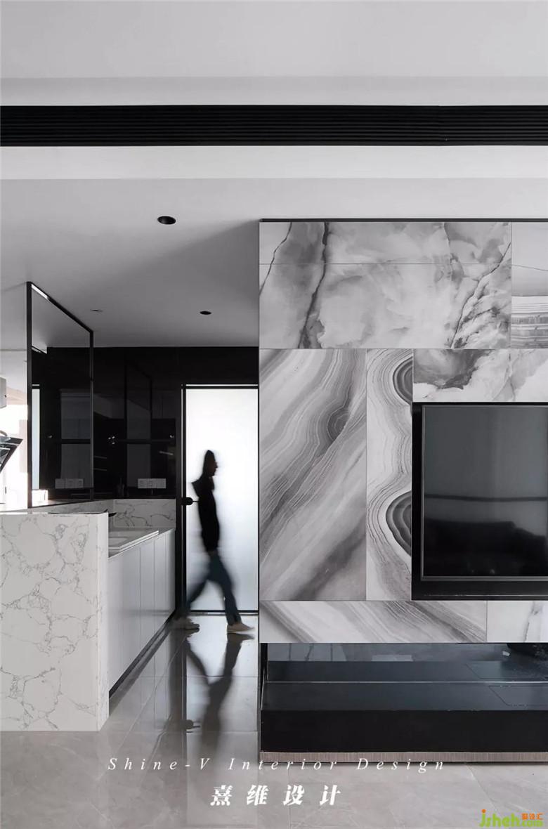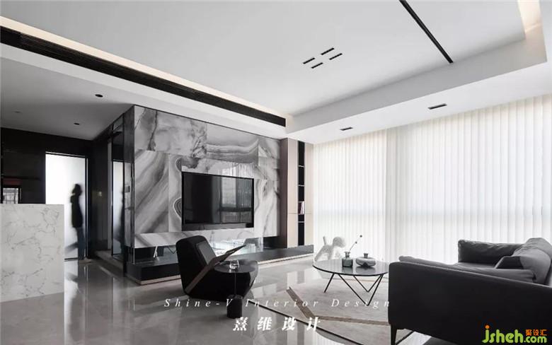▲在包容的黑白之下,電視背景墻選擇紋理富于變化的大理石以裝飾,包覆造型規(guī)整的墻面,如宣紙上的墨色,渲染出蜿蜒地貌、皚皚雪原,無跡可尋的變化里,韻味卻油然而生。