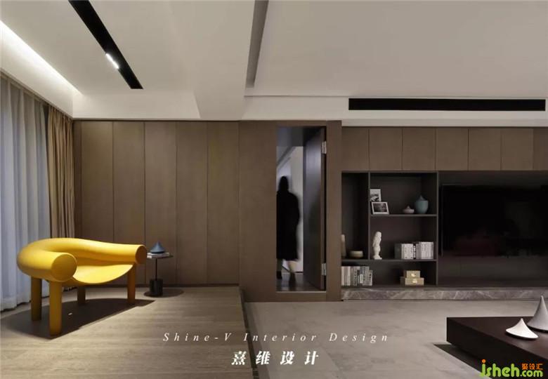 ▲電視背景墻與收納結(jié)合,胡桃木的雙飾面材質(zhì)以開放與帶柜門兩種形式讓收納得以周全。胡桃木,明暗適中,沒(méi)有故作深沉的內(nèi)容,是不動(dòng)聲色的安然狀態(tài)。帶著壁爐的白墻斜拼一塊黑色,至此一角氣氛明快、直白起來(lái)。