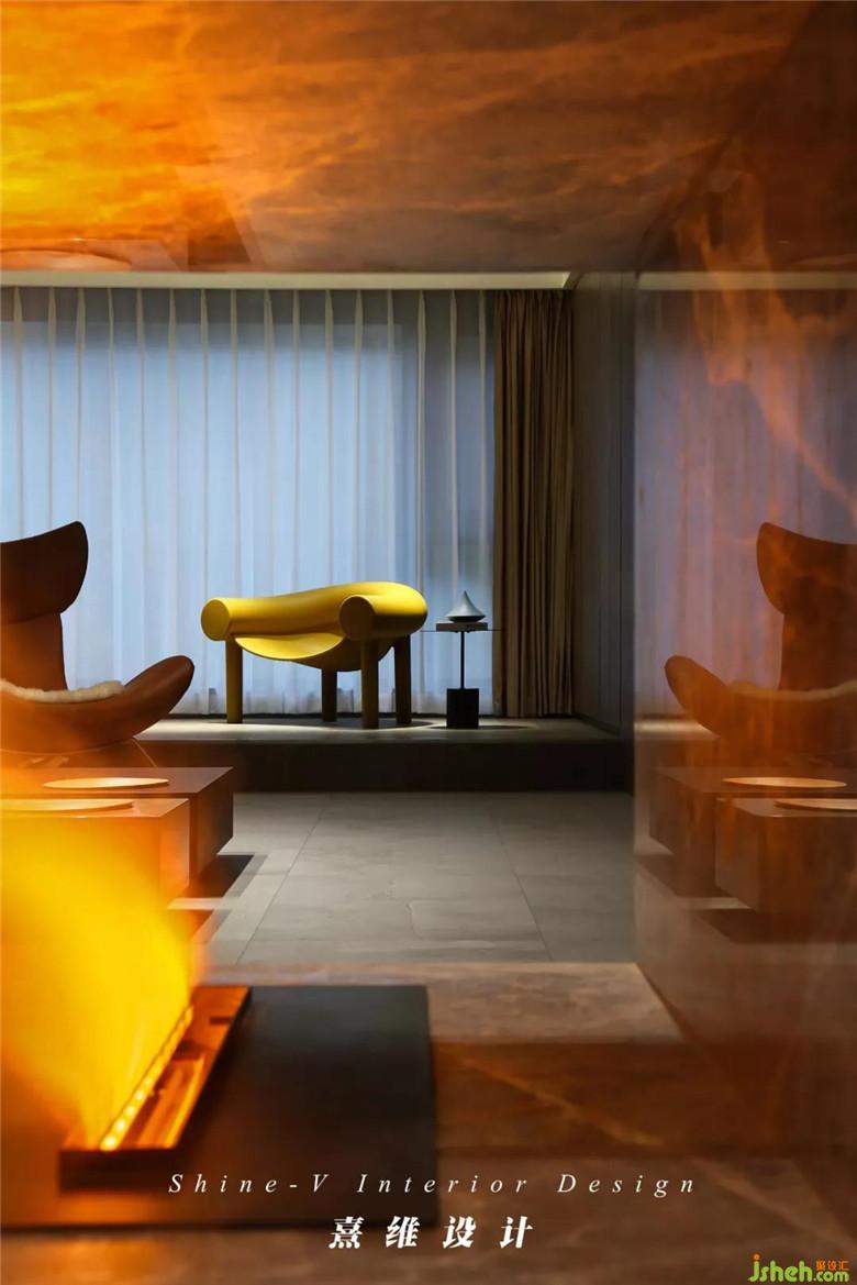 ▲柿子色的高背椅與焦糖色的單人沙發(fā)在溫暖基調(diào)的空間中沁出明媚與濃郁,不突兀的融入其中。在空中圓潤(rùn)滑過(guò)的燈,像一張完滿的弓,裝修公司將開闊空間的張力牢牢繃緊,是大卻不散漫的客廳。