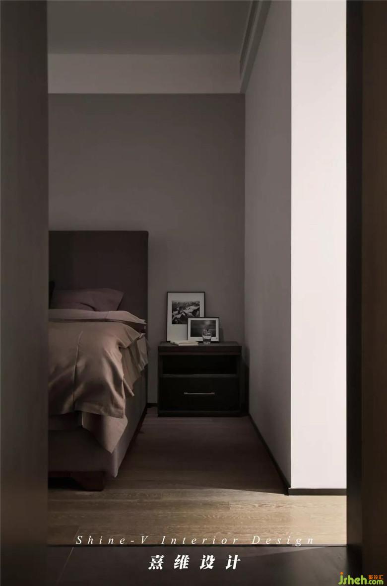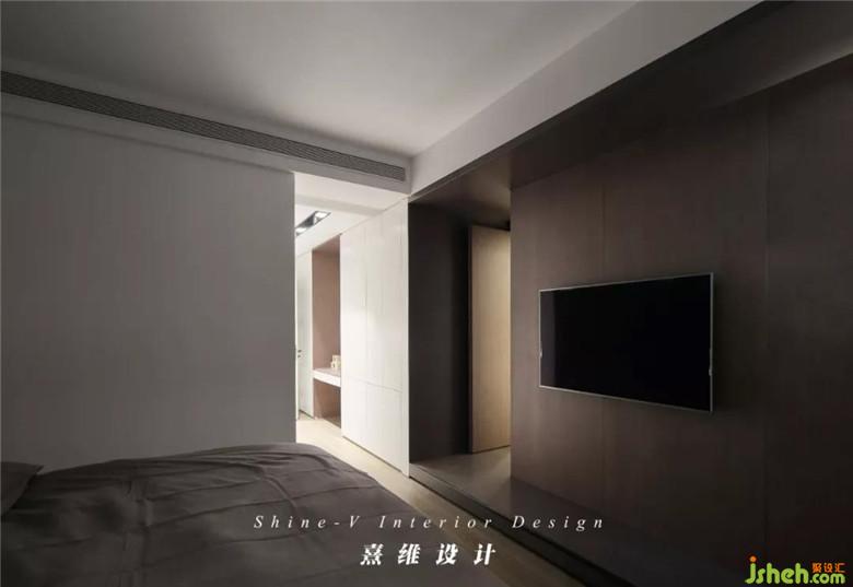 ▲多了一扇門的主臥,去往客廳、陽(yáng)臺(tái)不再需要兜一大圈。由客廳中延續(xù)而來(lái)的胡桃木雙飾面鋪陳在主臥的電視背景墻上,木色在夜晚更顯沉郁,浮躁被摒棄,沉浸在專注平和里,不受外物干擾。