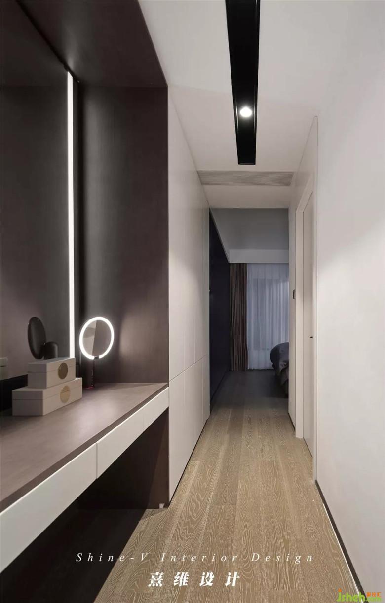 ▲柜子與柜子之間,嵌下一塊梳妝臺(tái)的區(qū)域,盡管在并不寬余的走道邊,但由于電視背景墻處的另外一扇門,走道被臨時(shí)占用也不會(huì)造成不便,椅子不用時(shí)可以收在梳妝臺(tái)之下,維持日常動(dòng)線的通暢。