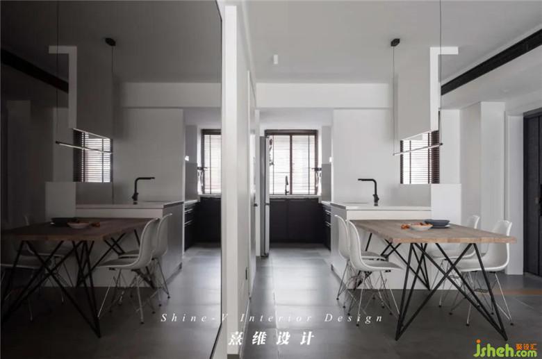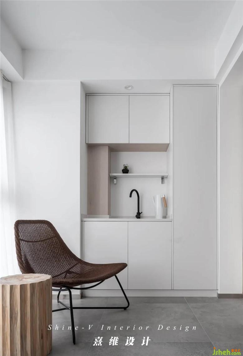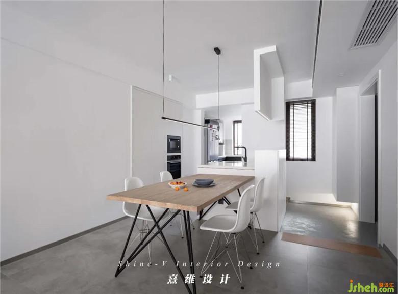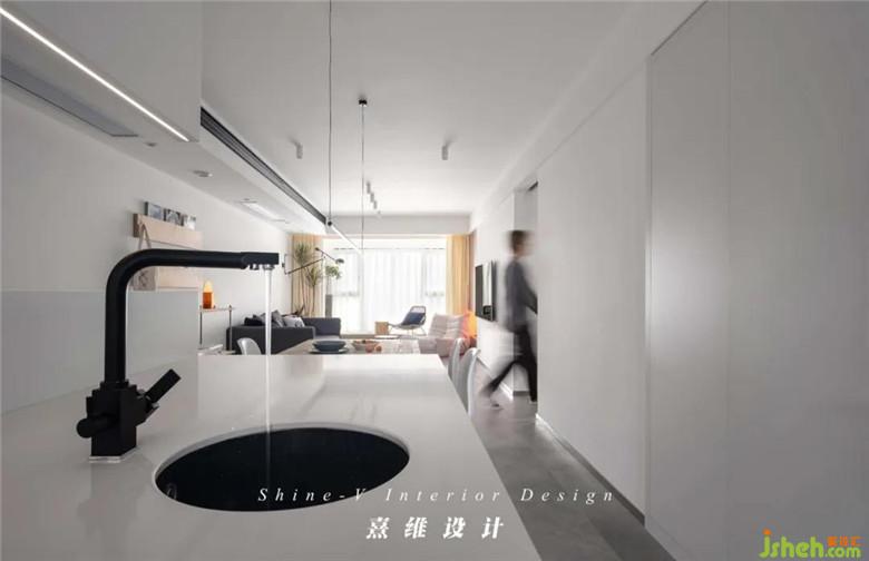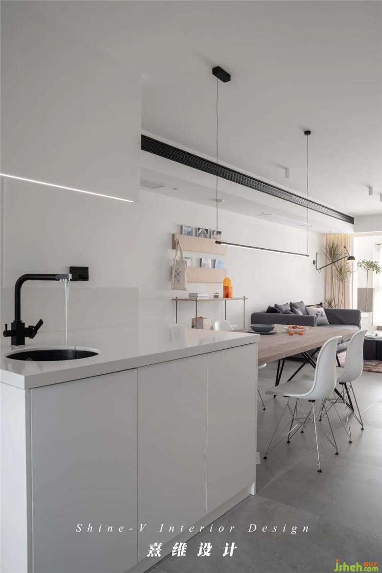 ▲“餐廚一體”是現(xiàn)代住宅中常見的生活場景,選擇這般滿目的白色、極簡的線條保證了功能復(fù)合空間中的最佳的穩(wěn)定感與秩序感。