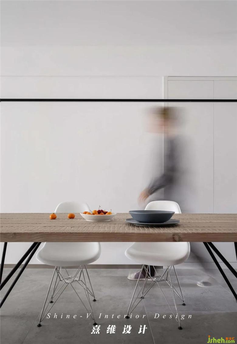 ▲餐桌椅的腿部線條不再是單純的支撐作用,他們同線性的吊燈一起,簡練而有序的點(diǎn)綴白色內(nèi)的層次,空間滲入猶如雕塑般的輪廓分割。原木色的餐桌表面有生動的紋理,打造此處豐富的空白,“隱性”的空相被“呈現(xiàn)”出空靈感,啟發(fā)人無限思緒。