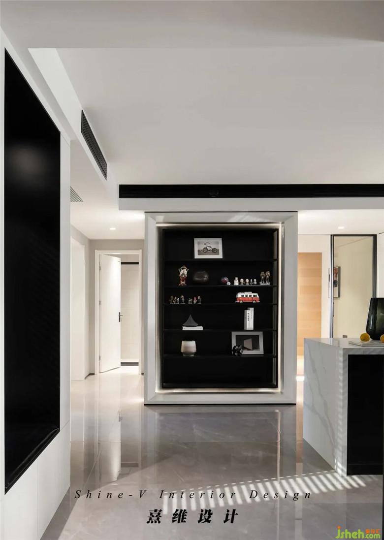 與入戶門相對的展示柜,白邊內(nèi)裹夾反光燈帶、黑色收納空間,構(gòu)成門后利落現(xiàn)代的視線落點(diǎn),擺放其中的物品被醒目的襯托出來。