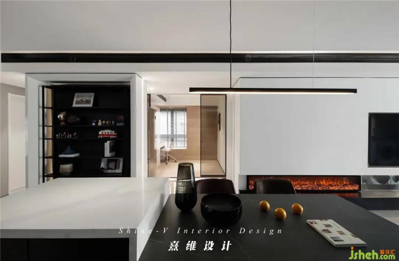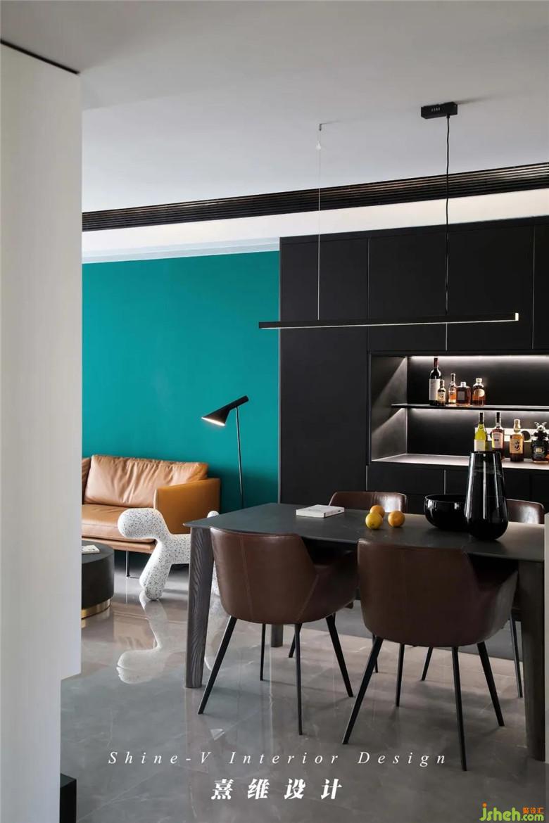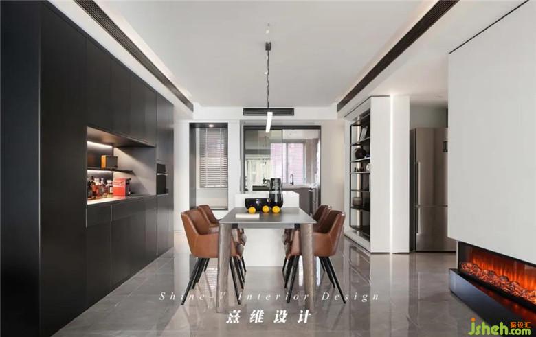 ▲充裕的空間,餐桌結(jié)合倒臺擺放之后,大型綜合性收納仍然可以妥善的安置在墻邊。啞光烤漆柜體黑色凝練出深思熟慮的時(shí)尚感,中部掏空、分割區(qū)域?yàn)橐司蛹骖櫣δ軐用娴亩喾N需求。