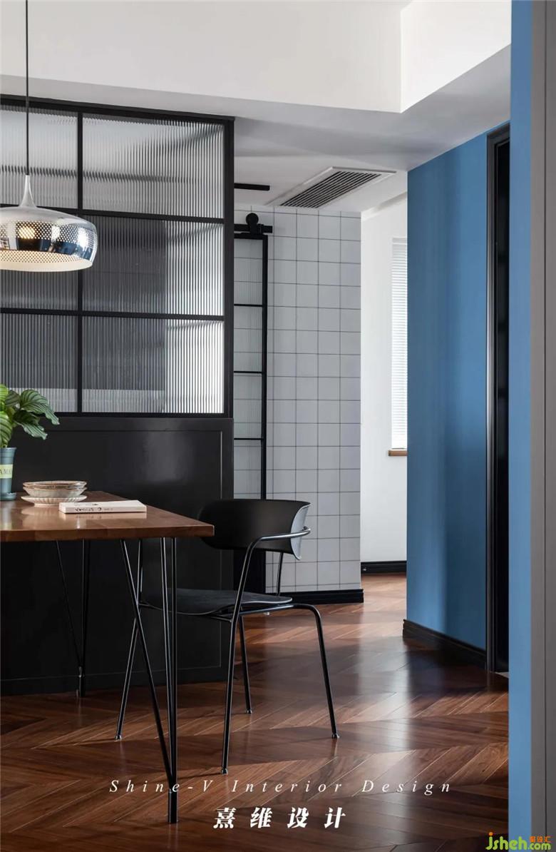 ▲廚房門邊的墻涂成藍色,作為餐廳一部分的配色,在同一個空間之下,與客廳的白色區(qū)分開來,裝修公司設(shè)計師利用同色同質(zhì),卻不同形式的門與墻,讓細節(jié)眾多的小空間顯得精細又整體,自由與靈活堆疊在復(fù)古式魚骨直拼地板上,通過對功能的提純使得自在變得容易獲得。
