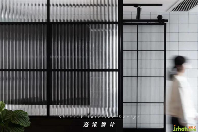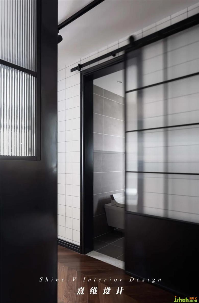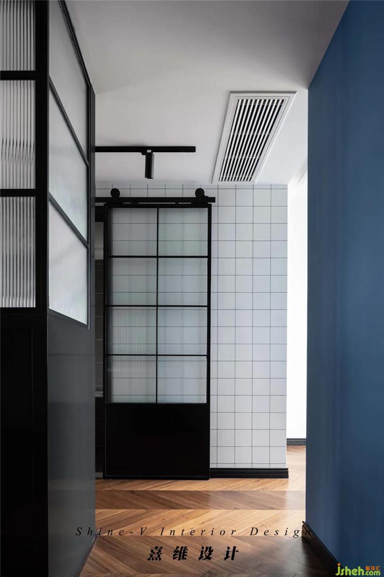 ▲衛(wèi)生間濕區(qū)拋棄傳統(tǒng)的類型的門,選擇帶長虹玻璃的谷倉門,極力擴大走道處的采光與通透度。