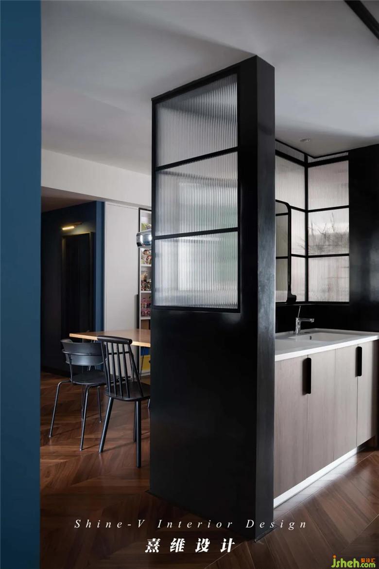 ▲裝修公司延伸了的墻面不是整堵實墻,上半部分以纖細的框架與透明的長虹玻璃搭配,成為了餐廳的背景,并不鄰近窗戶的餐廳也像是有了窗戶,而私密空間被護在了內(nèi)里。
