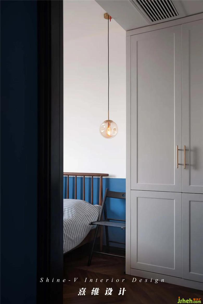 ▲次臥是個(gè)躺著就能看到江景的房間,墻面的藍(lán)白二色小小的呼應(yīng)了客餐廳配色,床邊的吊燈如漁火,剔透的糖殼一般可以驅(qū)盡一切霜色。