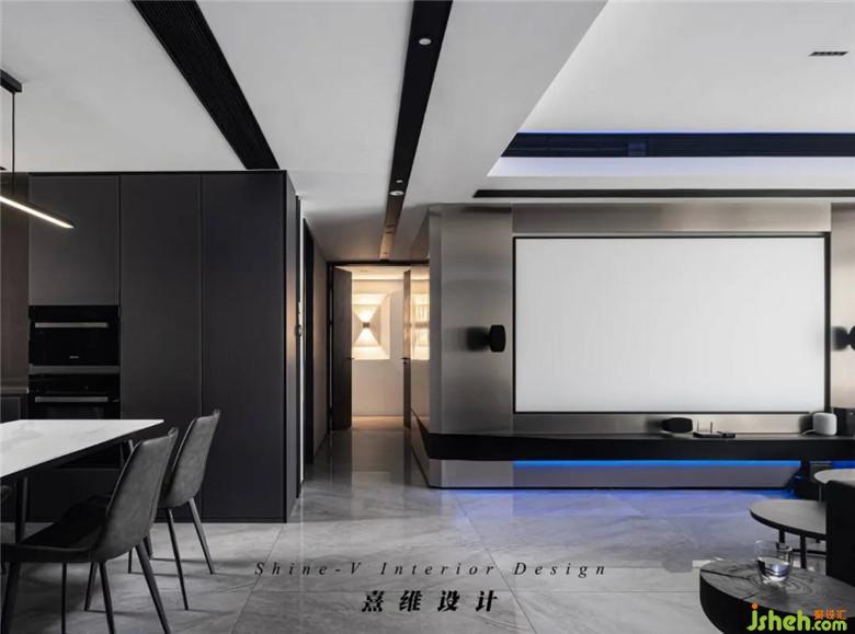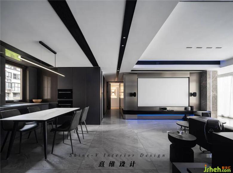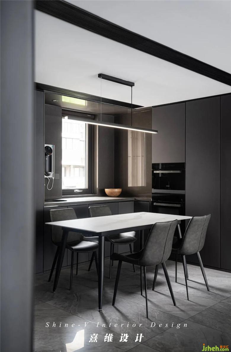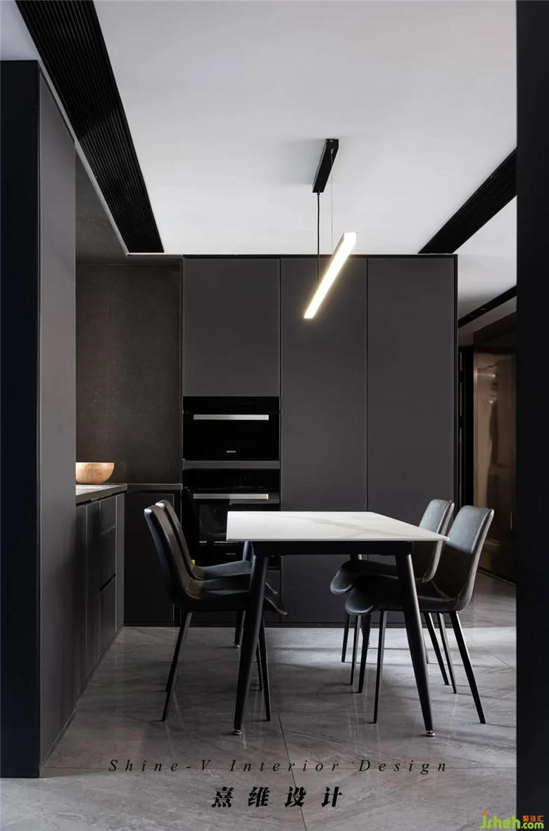 ▲到頂?shù)墓耋w包容餐廚電器及雜物,與島臺(tái)的地柜建立連接,為餐廳提供可觀的存儲(chǔ)空間。貫穿在空間中的深灰色柜體,啞光烤漆觀感細(xì)膩,連續(xù)的手法消除獨(dú)立感,于開放的空間中創(chuàng)造具有質(zhì)感的精神場(chǎng)域。