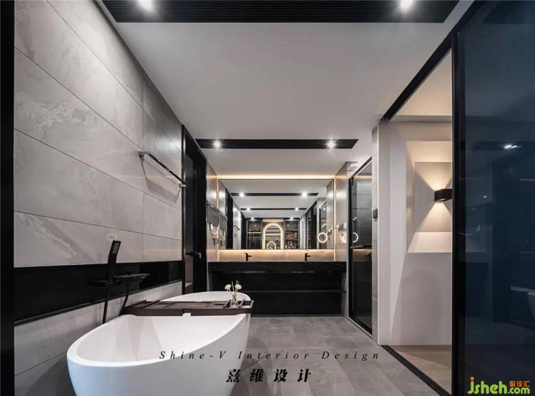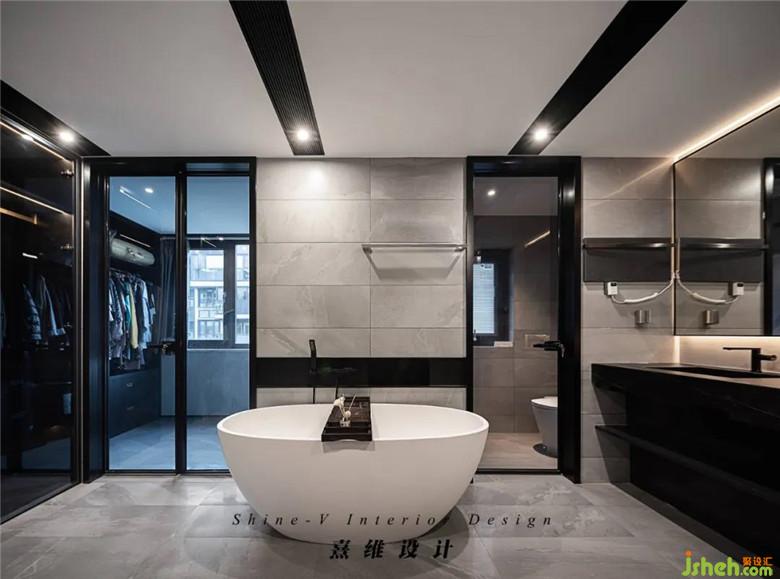 ▲裝修公司將原主衛(wèi)空間與鄰近的零碎小房間整合在一起,成為主臥套房的一部分。由于補(bǔ)充了足夠的空間,功能性得到極優(yōu)越的提升,浴缸放在中央,干區(qū)與梳妝臺(tái)分布在兩端,衣帽間、馬桶、淋浴間獨(dú)立于三個(gè)角落??臻g沒(méi)有分毫浪費(fèi),模塊之間相互關(guān)聯(lián)又互不打擾,在一起充分回應(yīng)使用者的需求。