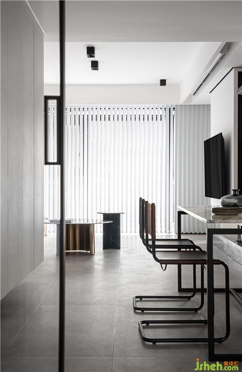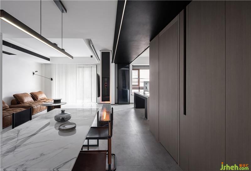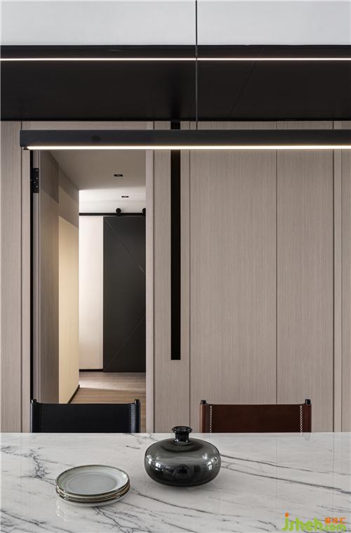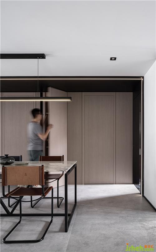 廊道的頂面,找到一個恰到好處的寬度,覆蓋上黑色啞光不銹鋼,貫穿公共空間兩端,至客衛(wèi)順勢而下,室內(nèi)設(shè)計(jì)師將入口掩藏在啞光金屬鋒芒不露的深沉中去,讓燈帶沿不銹鋼的走勢亮起細(xì)長具象的光,塊面總有線條跟隨,不空洞不孤立無援。