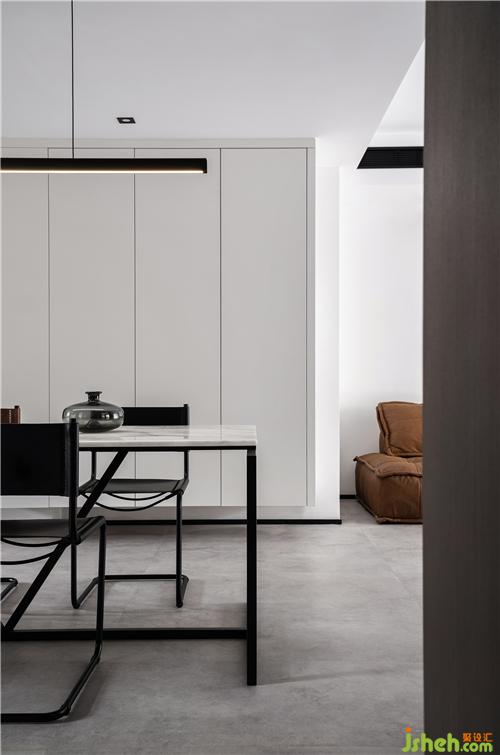 ▲餐廳靠近入戶處,室內(nèi)設(shè)計(jì)師在沿墻面分布柜體,底部保留懸空的姿態(tài)。日常時鞋可以半藏在下面,柜體有充足的空間容納衣物雜物,外表只著白色,自然銜接客廳白墻,光與空色聯(lián)結(jié),向你涌來的不是海浪,是臻于虛無的月色。