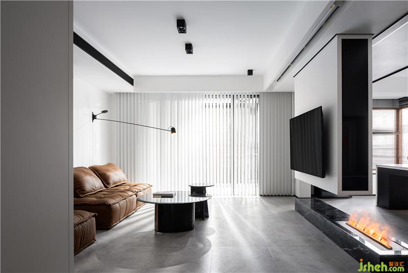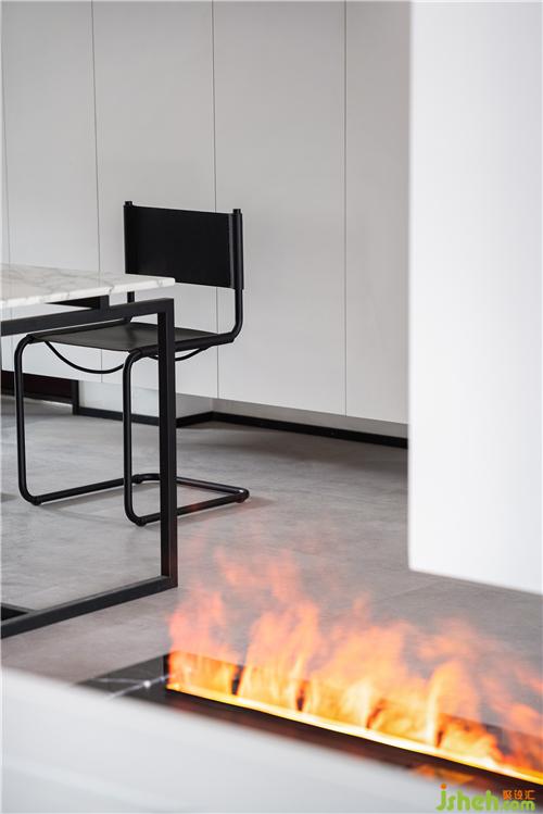 ▲從餐廳到客廳,視野連貫,電視不以實(shí)墻為背景,緊貼下掛的隔斷微微勾勒出客廳的邊緣。從地面壘起石材包覆的地臺與上方隔斷遙遙相迎,霧化壁爐嵌入其中,不時打開可與氛圍相和??蛷d空間無需過度裝飾,得到光和視野的優(yōu)待,室內(nèi)設(shè)計(jì)師的留白和點(diǎn)綴便是朝雨浥清塵。