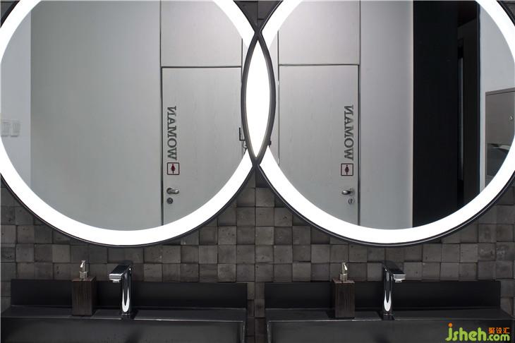洗手間中,現(xiàn)代材質(zhì)與中國古典哲學(xué)發(fā)生碰撞,圓鏡符號如陰陽交界,暗喻天地和而萬物生。