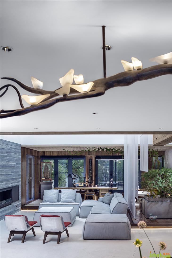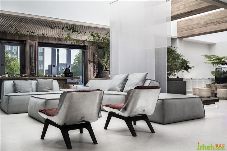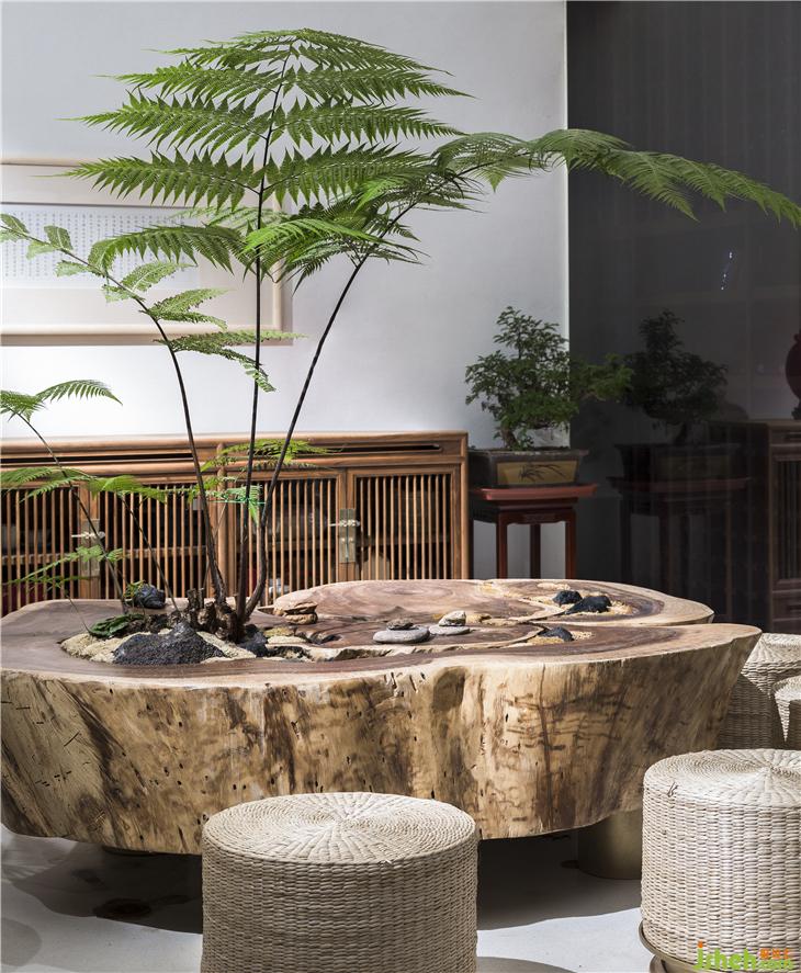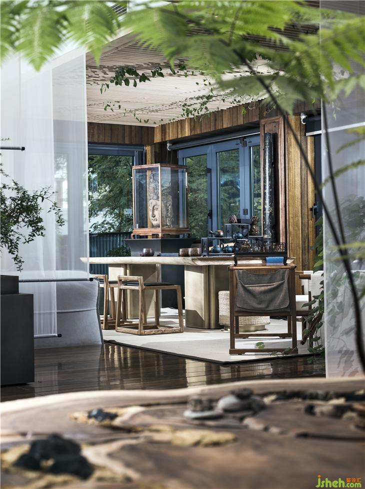 就如這個景觀桌臺,自成一景。設計師從泰國偶得,將其置于此,獨享“天然去雕飾”的美感。飲茶、賞景,談笑有鴻儒,往來無白丁。