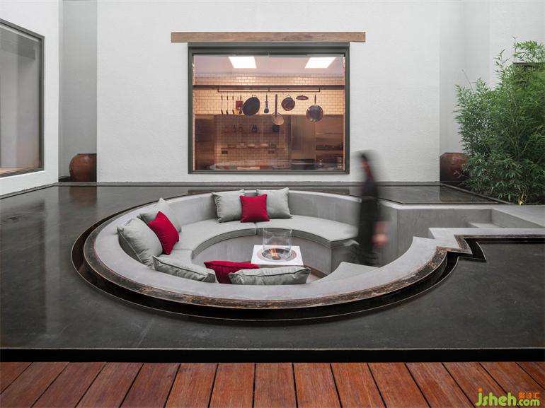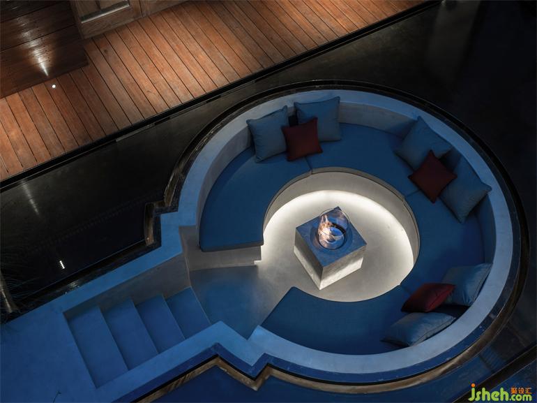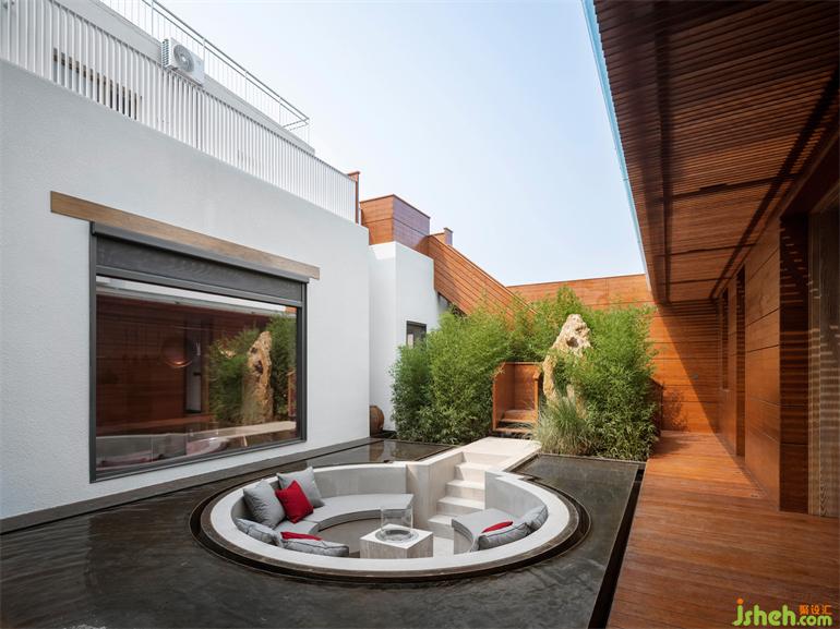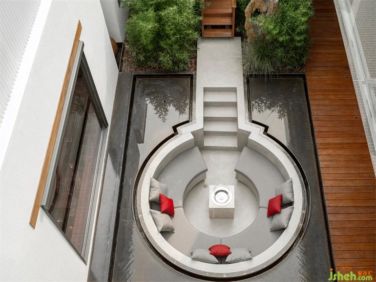 別墅裝飾設(shè)計(jì)師在房子的中央插入了一個(gè)類似亭子的區(qū)域,把緊張的、人工的內(nèi)部空間打通放進(jìn)環(huán)境里。水泥圍合的下沉區(qū)嵌入薄薄水面,小孩們常在庭院的水池間來(lái)回跳躍,水面的寬度剛好適合他玩耍的步幅。