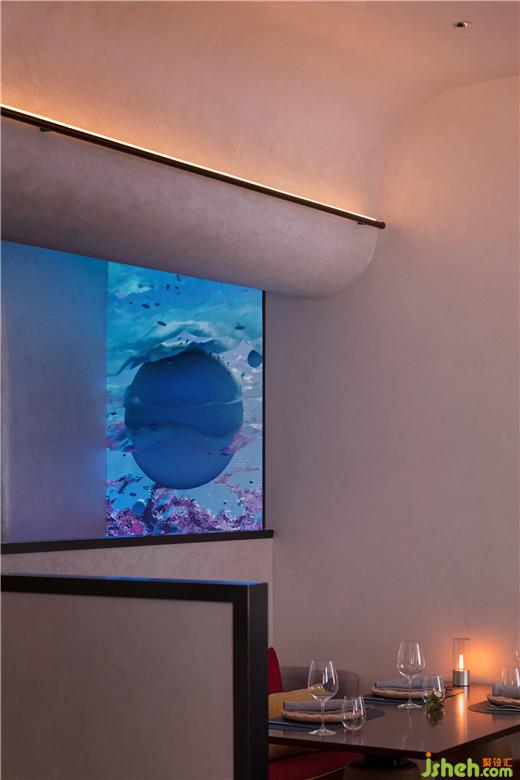 來自多媒介藝術(shù)家陳熹的數(shù)字作品以其極具未來感的超現(xiàn)實(shí)性與空間的懷舊浪潮碰撞,怦然之力顯現(xiàn)——自由的生命體表達(dá)豐盛的組織關(guān)系,游離的、浪漫的、自由的、水狀的......將難以言明的情感關(guān)系和生命能量向更遙遠(yuǎn)、更宏大的方向擲出。餐廳設(shè)計(jì)數(shù)字藝術(shù)將整個(gè)空間的氣息攪動(dòng)起來,無論坐在哪個(gè)位置,泡沫和流水都能進(jìn)入視野,成為意識的河流汩汩向前。
