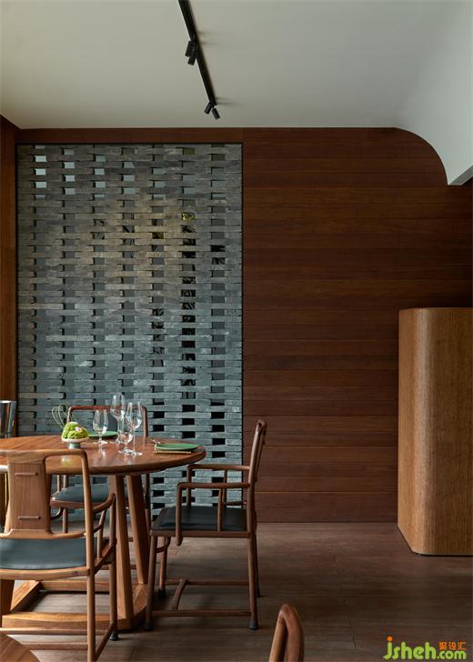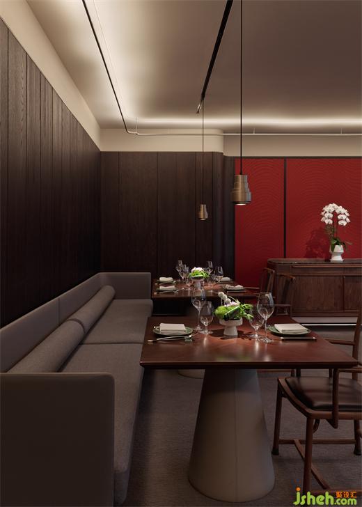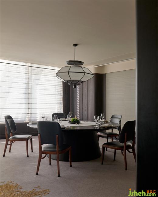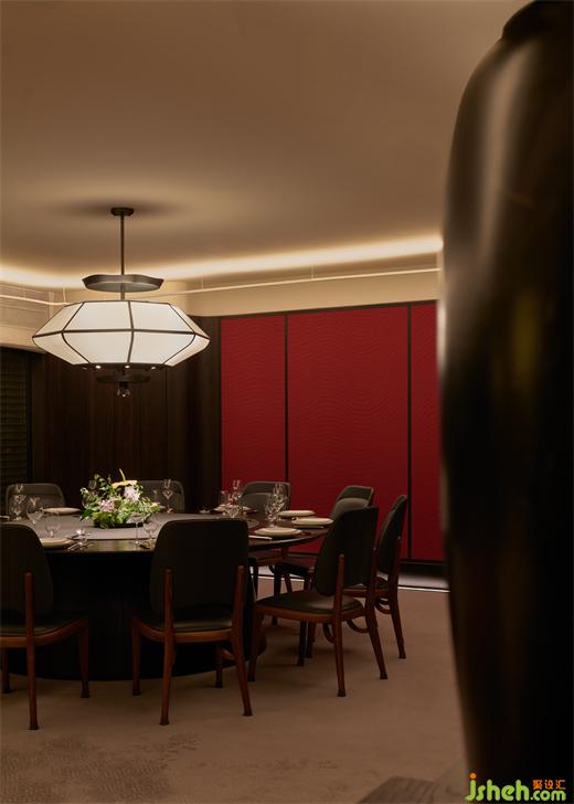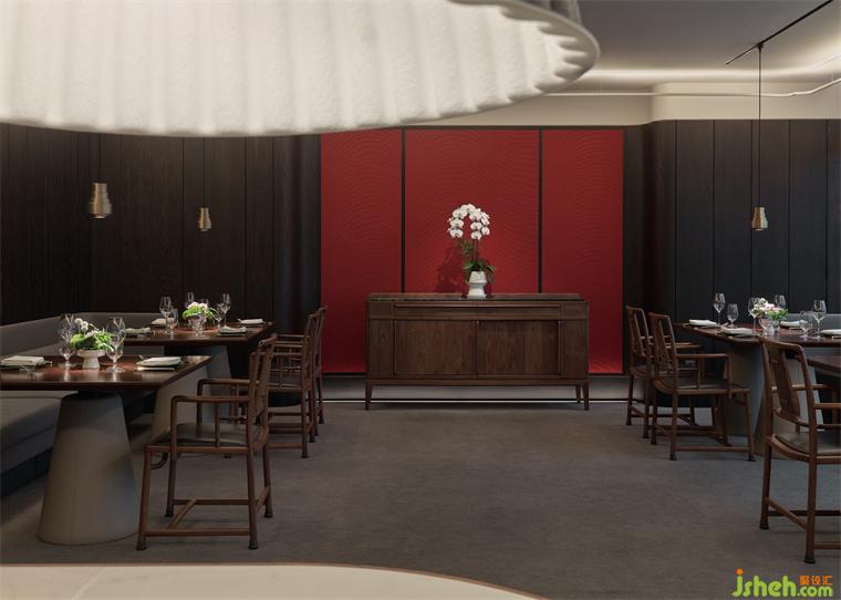室內(nèi)大量使用了由宋明家具改良而來的原創(chuàng)家具,菱形編織的地毯以凹凸云紋、水紋向留白鋪陳,虛實相映。少量形制簡潔的意式家具穿插其間,做傳統(tǒng)與東方向全球語境的過渡,而這也符合餐廳的商務定位。