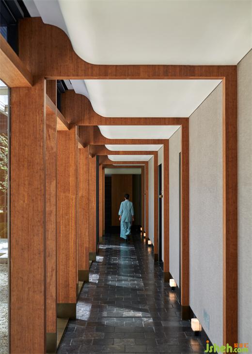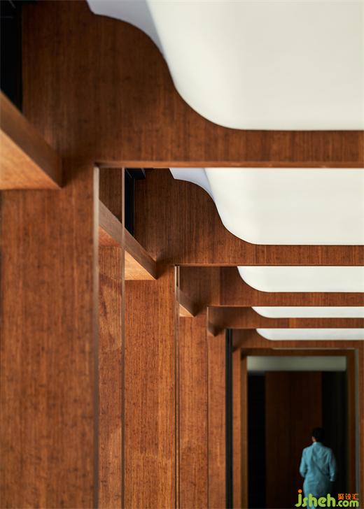 在不改動空間結(jié)構(gòu)的基礎上,餐廳設計調(diào)動寫意與白描的處理手法,大筆觸鋪陳內(nèi)部,游刃有余地運用竹皮、竹板、長城磚交疊,與原始結(jié)構(gòu)穿插共構(gòu),結(jié)合大量留白,完成內(nèi)部豐富的“山水地景”,與園林有相映成趣之感。在此基礎上,更為精巧簡潔地勾勒筋骨,中國傳統(tǒng)文脈中官帽、如意、拱的形態(tài)彰而不顯,卻柔韌有力地撐起整個空間,如打磨近四個月的燈籠,端然簡潔。