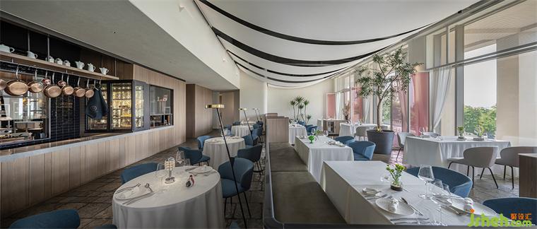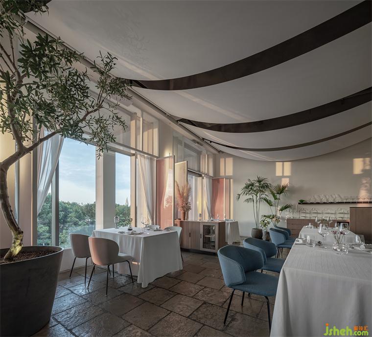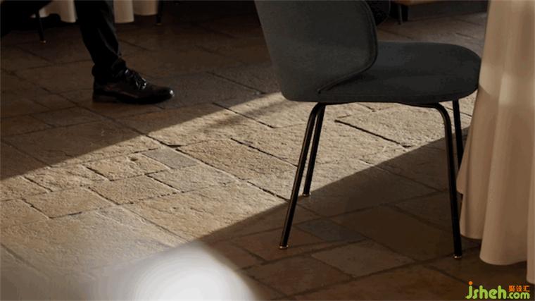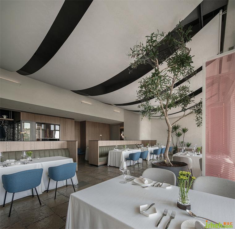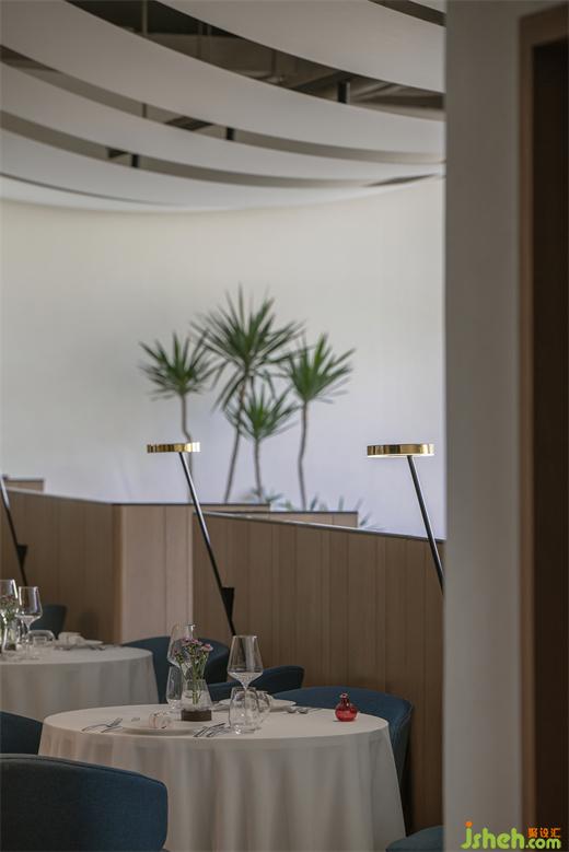法式餐廳設(shè)計通過現(xiàn)場調(diào)整地面磚縫寬窄實現(xiàn)扇形鋪貼