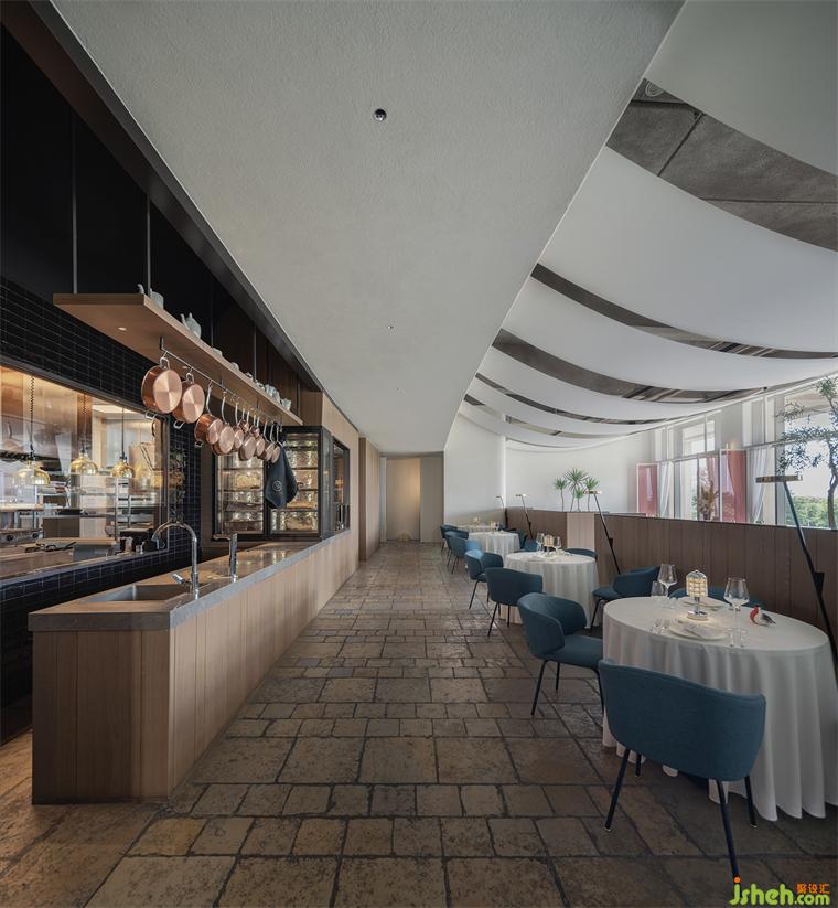 二樓空間是一個向海“敞開”的空間,廚房占據(jù)半壁空間,從吧臺至后廚房再到能看見戶外的窗口,主廚的空間尺度令人獲得探訪友人的親近感,主廚一襲黑衣融入黑色手工磚鋪貼背景,吧臺上方懸掛昂貴但經(jīng)久實用的銅制鍋具(來自意大利品牌拉歌蒂尼),熟成牛肉正在發(fā)酵柜內(nèi)將復(fù)合氣味發(fā)揮到極致。遠(yuǎn)離故土,這間廚房讓Peter不再是一個異鄉(xiāng)人。