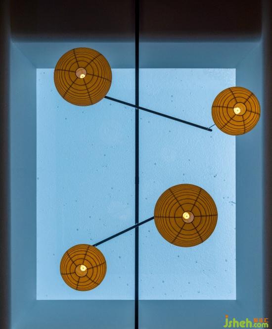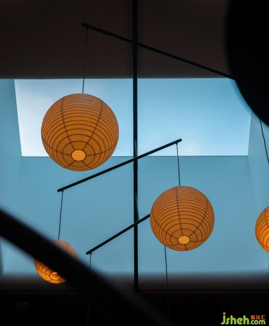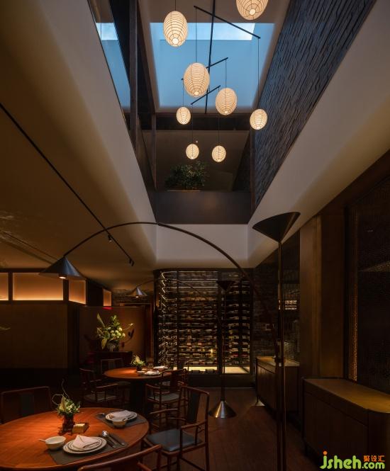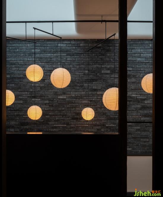 另一處矩形挑空在U型酒窖和散臺(tái)側(cè)上方。酒窖凈透如琉璃,光在其上的反射再次回應(yīng)了水的意向,優(yōu)雅的枝型落地?zé)翡﹂_(kāi)光暈。視線由此向上,現(xiàn)代性逐漸被高懸陣列的紙燈籠模糊,灰墻斑駁、樹(shù)影婆娑。