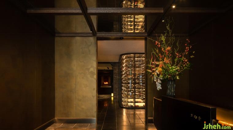 Another rectangular opening hovers above the U-shaped wine cellar and the surrounding tables. The cellar, clear as glass, reflects light that once again echoes the imagery of water, while elegant branch-shaped floor lamps cast a soft, spreading glow. As the eye is drawn upwards, the modern elements gradually dissolve into a blur of hanging paper lanterns, with dappled grey walls and the flickering shadows of trees.