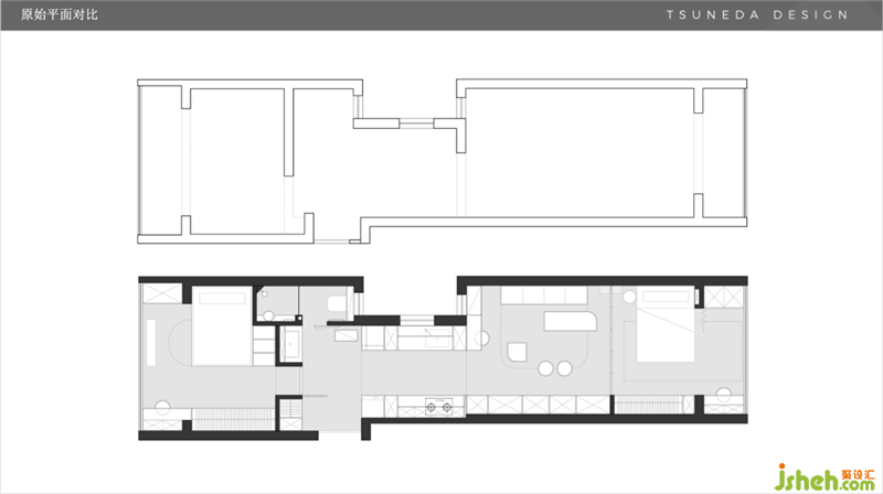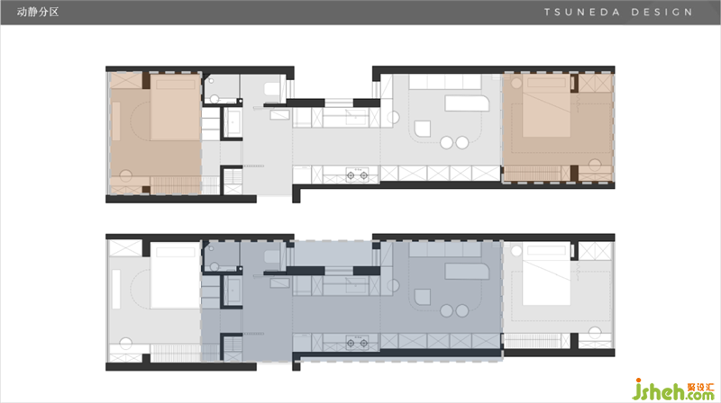 主臥連接起居空間,同時需要借助南陽臺的自然光照明,中間沒有墻體遮擋,主臥的隱私性和整個起居空間的采光是設(shè)計師需要著重思考和解決的問題。