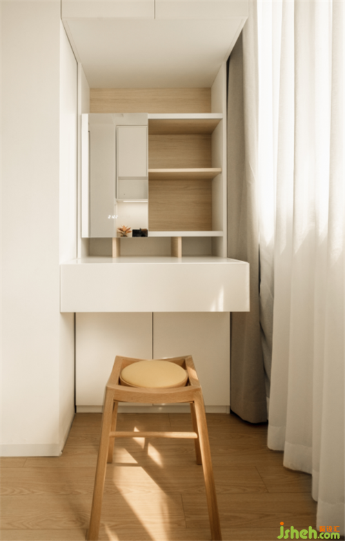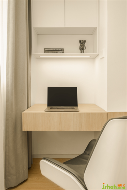 連接主臥的南陽臺,一側(cè)布置了女主人的梳妝臺,一側(cè)成為了男主人的辦公區(qū)。鑒于男主人長期在家辦公的工作需求,設(shè)計(jì)師選擇了全屋光線最好的位置,搭配舒適的辦公桌及符合人體工學(xué)的辦公椅,即使在這里工作一整天,也不會讓身體感受到壓迫感。