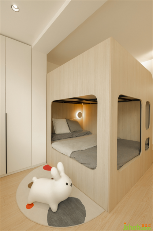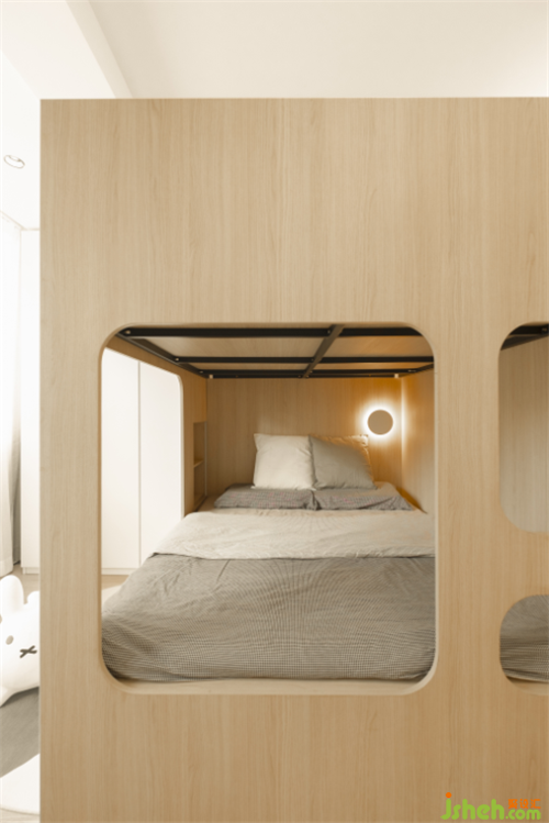 設(shè)計(jì)師使用了可移動(dòng)的上下床——下層空間保證了外婆的起居舒適度,上層空間是屬于女兒的小天地。像一個(gè)“時(shí)光盒子”,讓每個(gè)人都享有更舒適的居住體驗(yàn)。“盒子”一側(cè)可以爬上爬下的踏步臺階,北京裝修設(shè)計(jì)形式上營造出了些許滑梯的儀式感,也給愛玩滑梯的女兒帶來了一些小歡樂。
