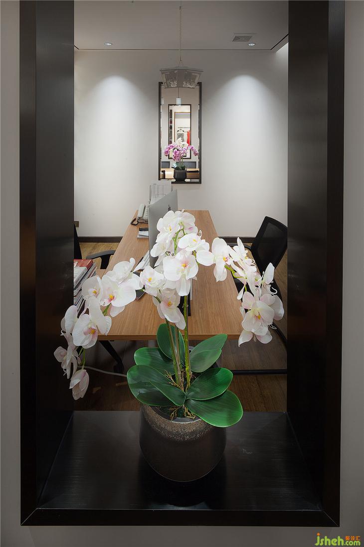看似裝飾的壁窗實則暗藏玄機,半開放式的設(shè)計讓辦公區(qū)域采光更好,窗明幾凈。蝶蘭點綴,立顯品味。