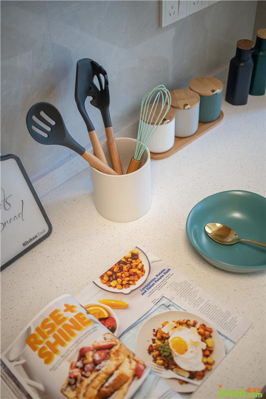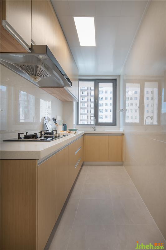 廚房不大,勝在干凈整潔,家電櫥柜一應(yīng)既全。在設(shè)計上室內(nèi)設(shè)計師做到讓小空間利用率最大化,讓廚房收納不躡手躡腳。