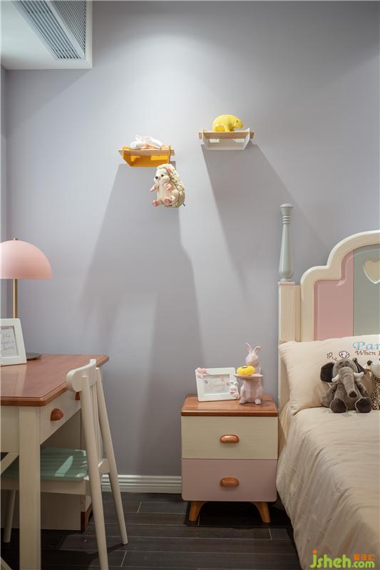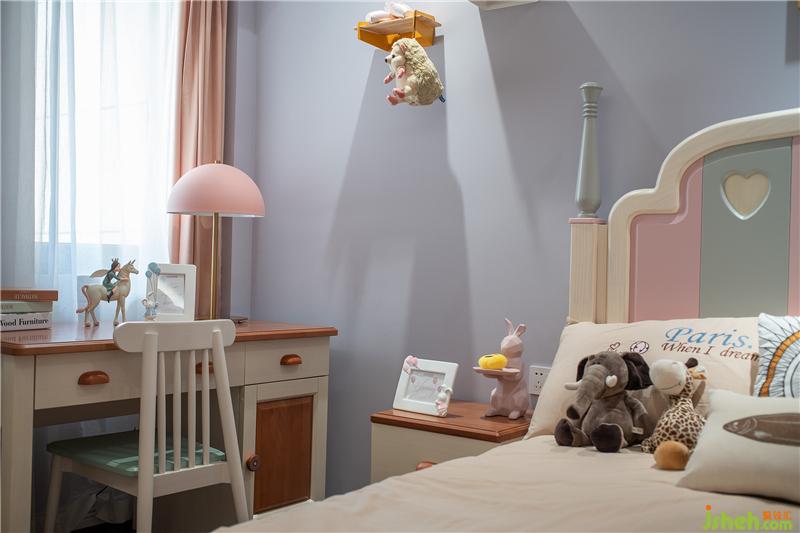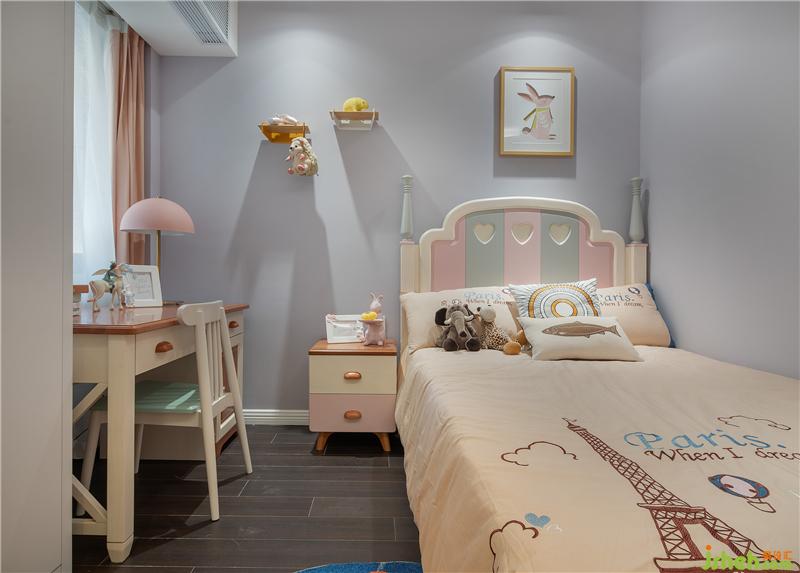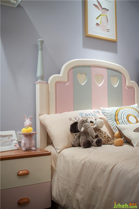 兒童房的設(shè)計充滿童趣,設(shè)計師在色彩搭配上繼續(xù)沿用小清新風格,粉色、米色與天藍色的配合,營造出溫馨淡雅之感。