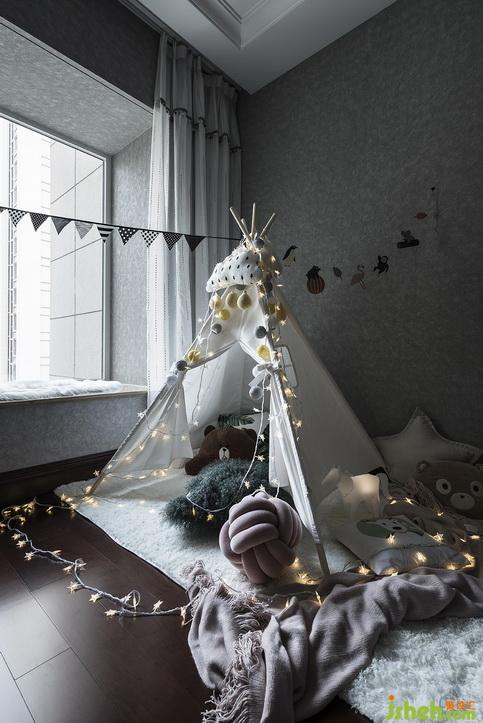 童趣十足的兒童房在寶寶沒有到來之前,是女主人童心未泯的一塊少女自留地,沒事兒來到小帳篷里,盤腿而坐,擼擼貓,擺弄擺弄毛絨玩偶,就好像回到了無憂無慮的童年。
