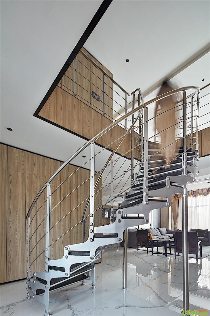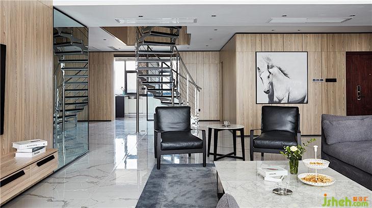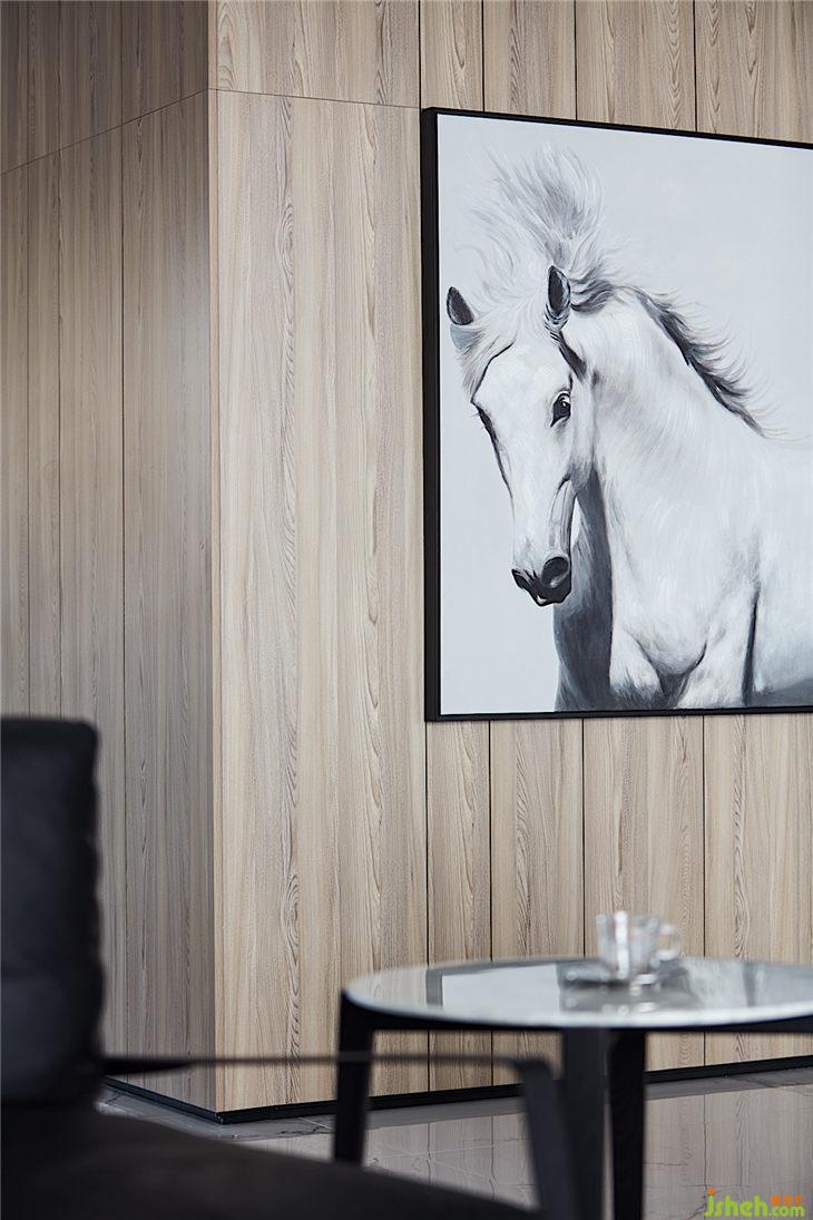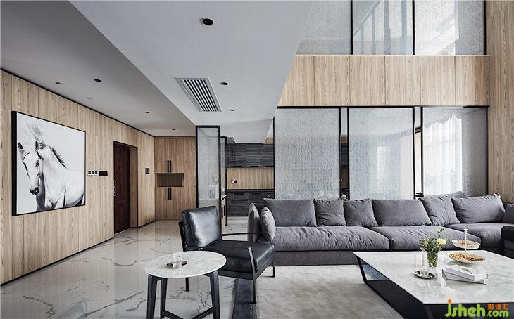 主材名稱(chēng):雪花白大板瓷磚,淺灰色護(hù)墻板,夾絲藝術(shù)玻璃,灰色木地板,黑色金屬收口件等。
