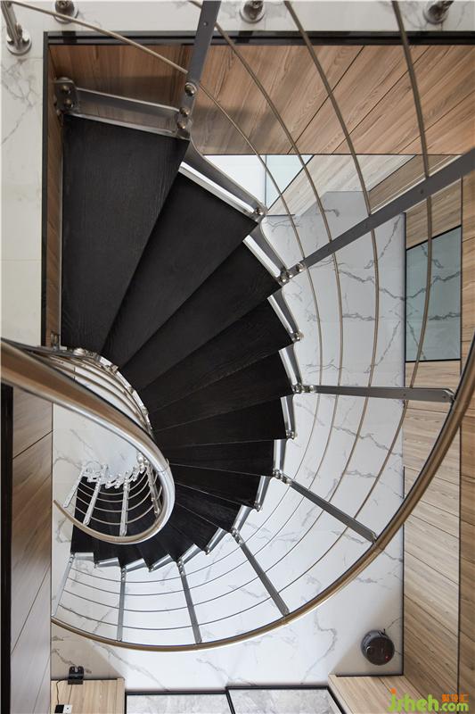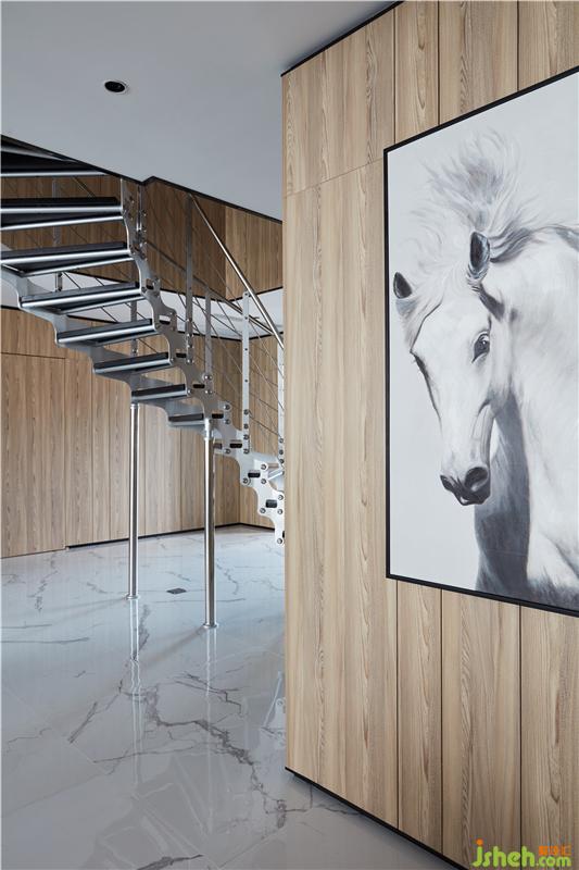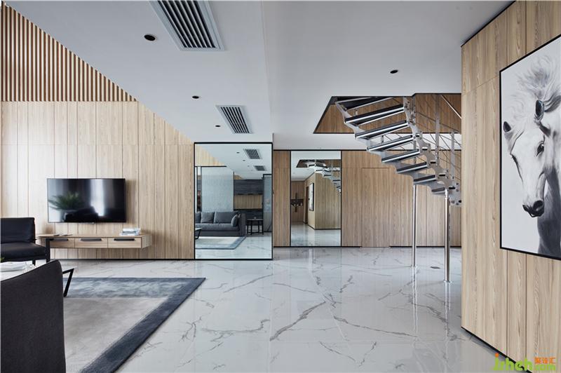主材名稱:雪花白大板瓷磚,淺灰色護墻板,夾絲藝術玻璃,灰色木地板,黑色金屬收口件等。