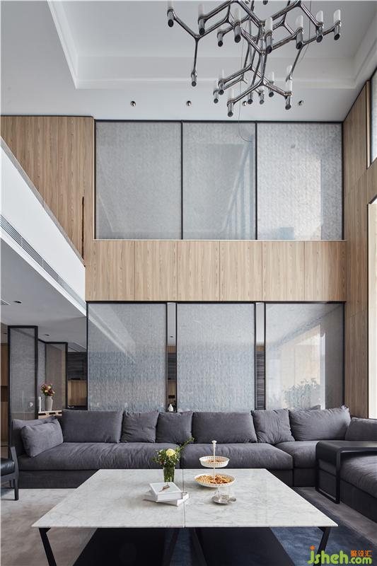 客廳的挑高空間,是整個項目的最大亮點,我們希望整個空間能體現(xiàn)年輕而不失品味的質感,所以地面用了大面積的爵士白大板磚,墻面我們則選了淺灰色的成品護墻板,一樓的餐廳隔斷以及二樓娛樂室的窗戶,通通用夾絲藝術玻璃來裝飾。黑-白-灰,通過不同材質和比例的呈現(xiàn),一直都是經典的搭配方案。整個設計中,最吸引的軟裝搭配就是這套寬大的沙發(fā)了。