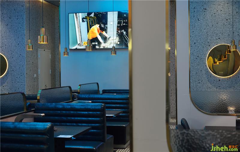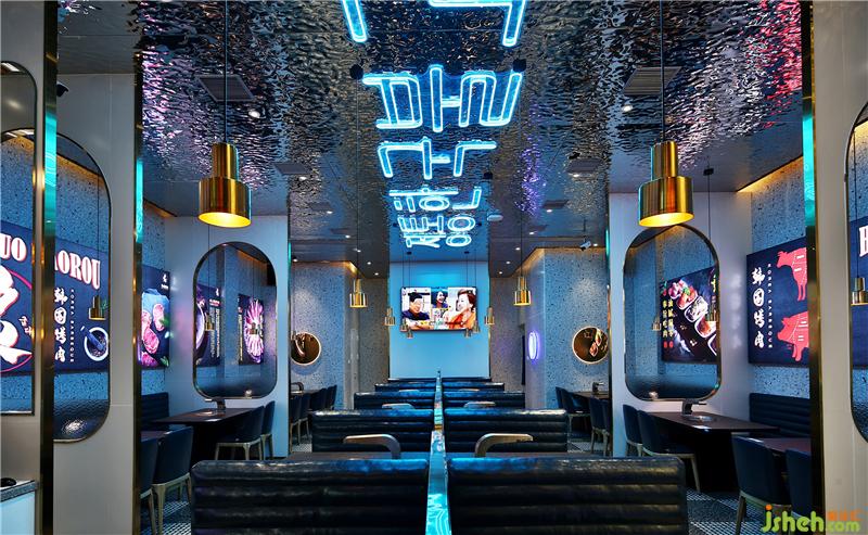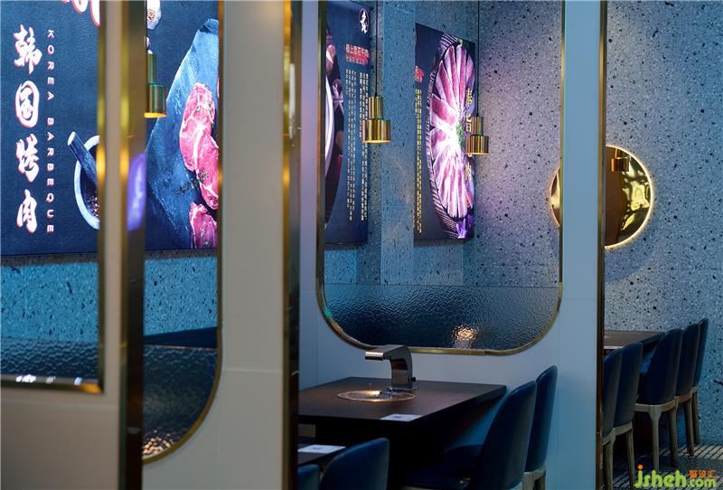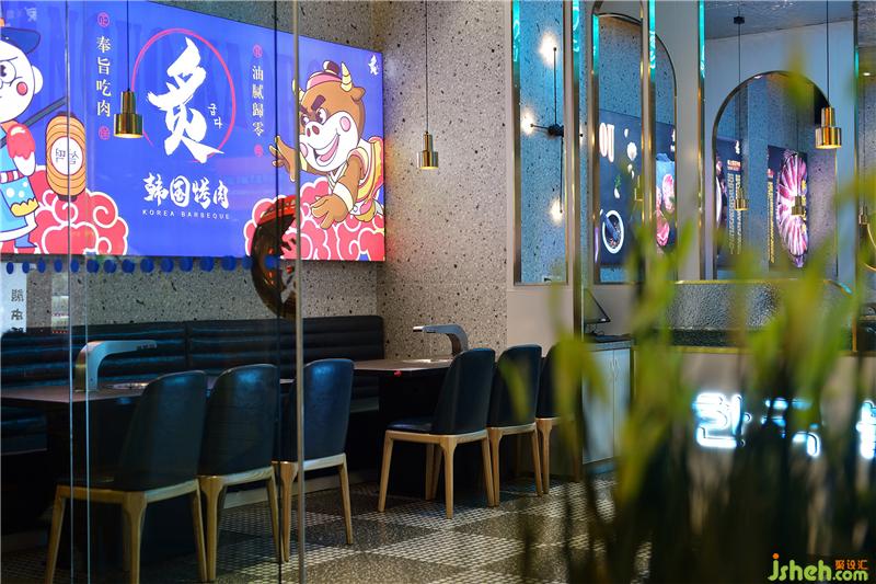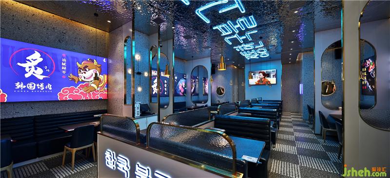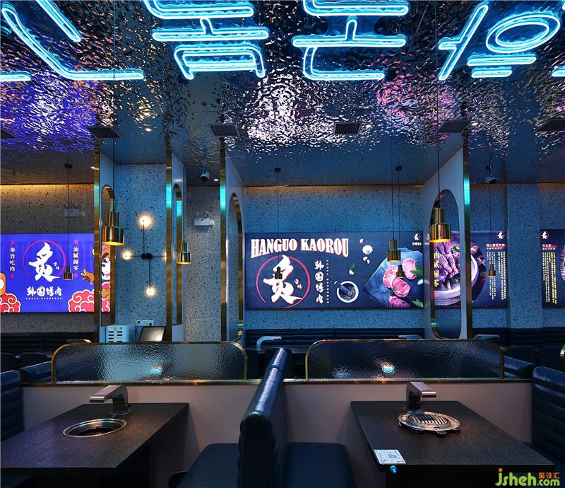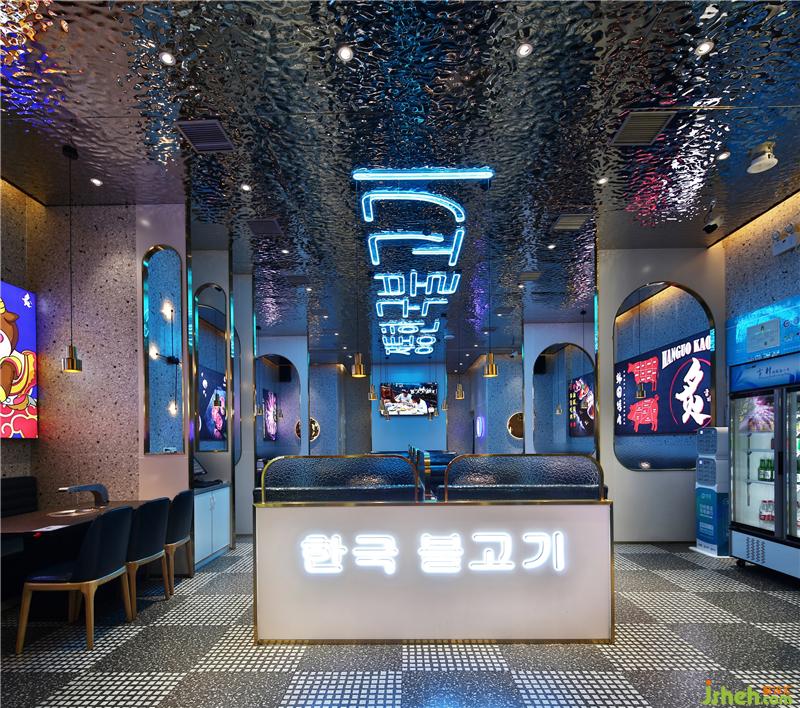 進入大廳左右兩側(cè)的卡座區(qū),環(huán)繞著醉人的燈光,柔軟的淡藍色,加之一抹興奮的橘黃,以及波光粼粼的天花,給人一種海洋中的感覺,而在這時,桌面上滋滋作響的烤肉,以及香味又把人們拉回到現(xiàn)實當(dāng)中,開始這趟美食之旅。
