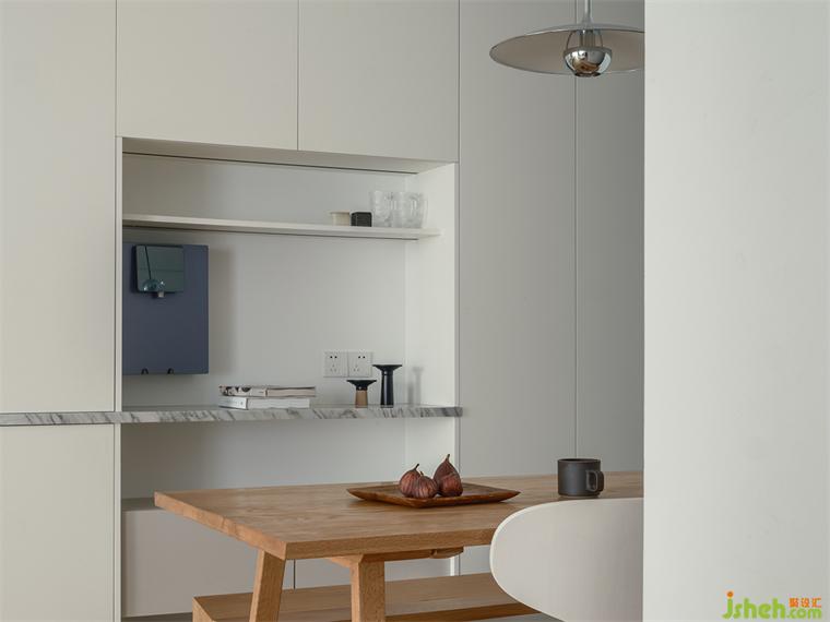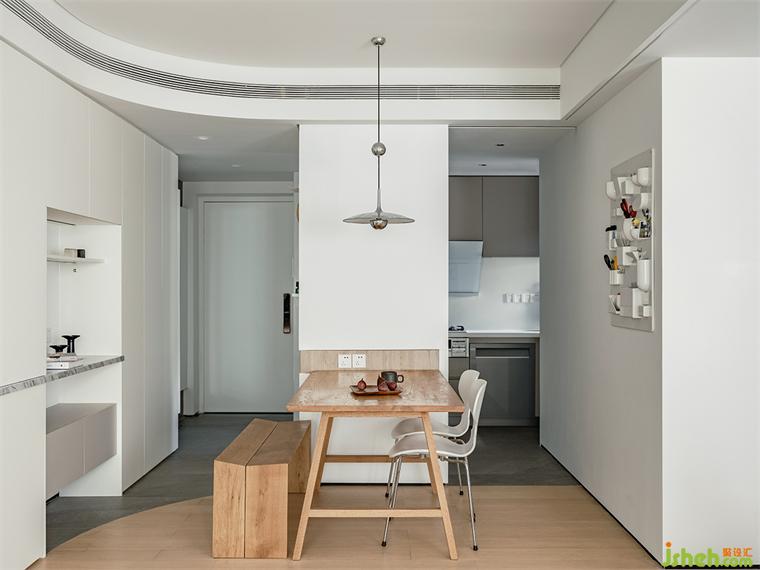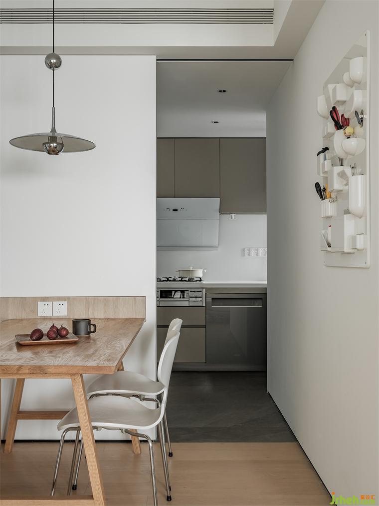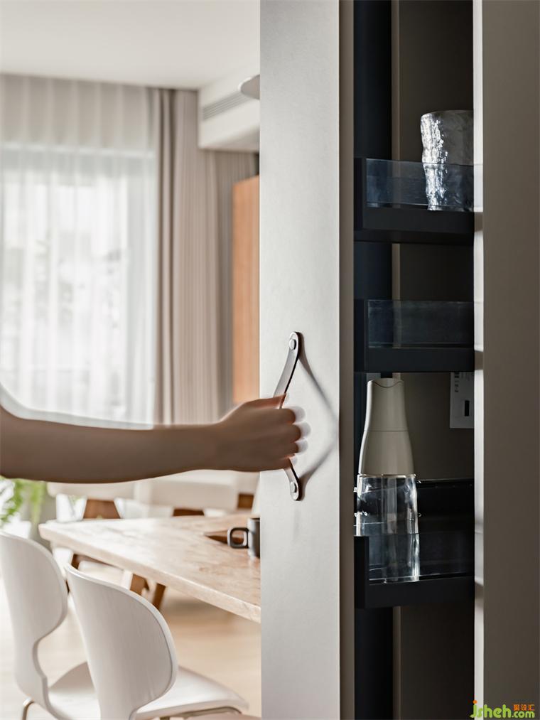 房屋的入戶與餐廚空間局促,予象空間化硬傷為契機,將冰箱與餐桌共構(gòu),中間暗藏儲物柜,形成全新的餐廚一體化體驗;并以隱藏于冰箱兩邊的兩道移門,為廚房創(chuàng)造可開合的機能,裝修設(shè)計讓居者享有更便捷的環(huán)形動線。