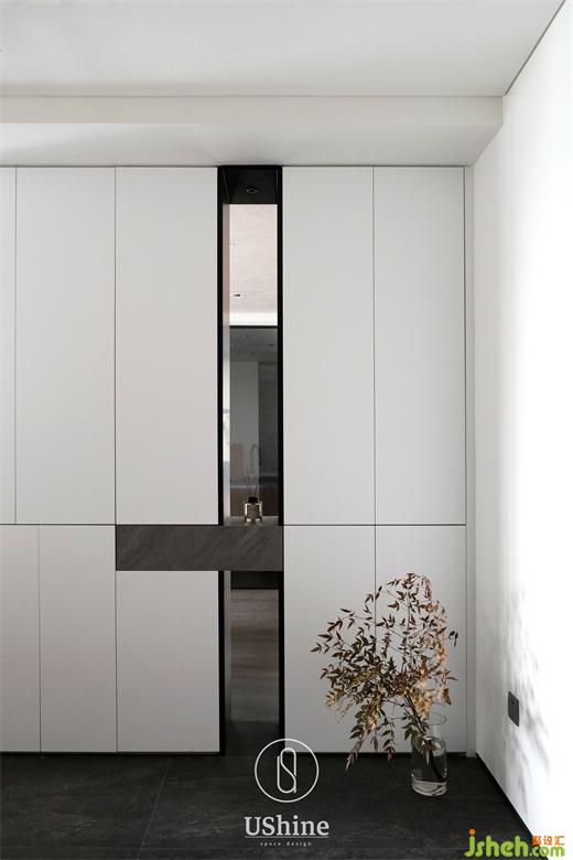 男主人希望有一個開放式的工作室,并能在需要時閉合。深圳海納公館家裝設計我們打掉最小臥室的非承重墻部分,將光線引入玄關,利用承重墻體做自然分隔,沿另一面墻依次設置封閉柜體、開放書架和書桌,延伸至飄窗,舒適而明亮。